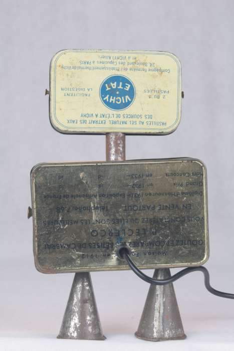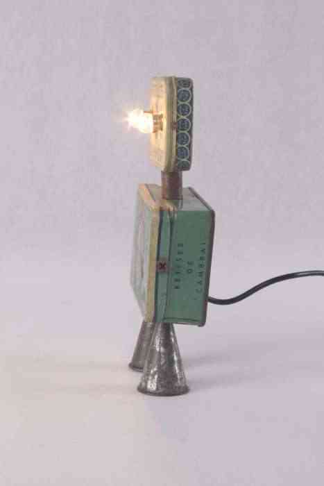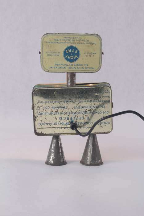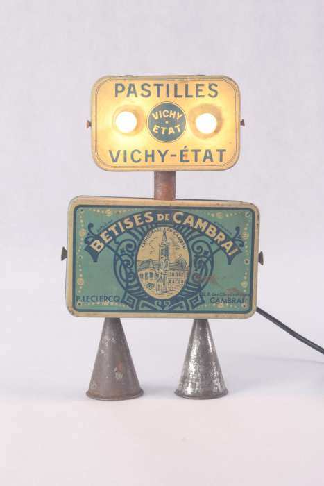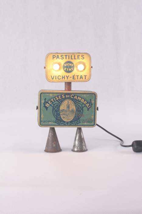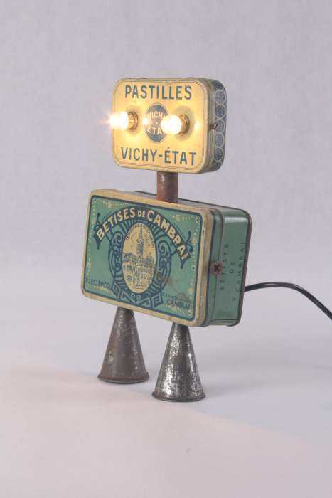 Personnage par assemblage de boites anciennes « pastilles Vichy-état » et « Bêtises de Cambrai », embouts de poche à douille de pâtisserie.