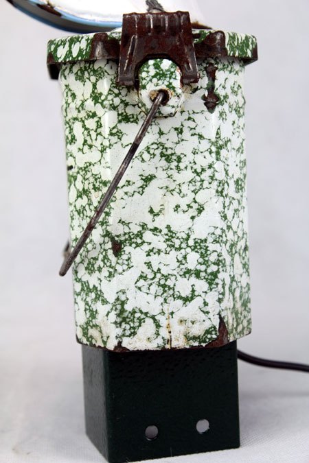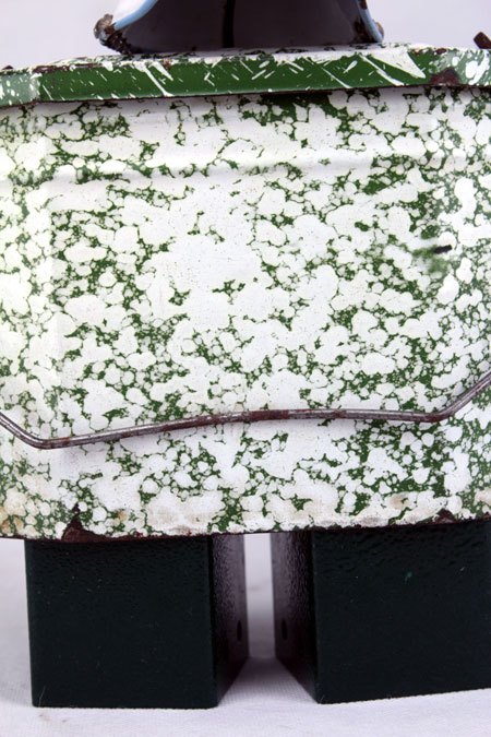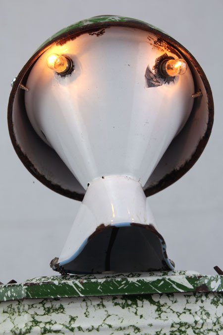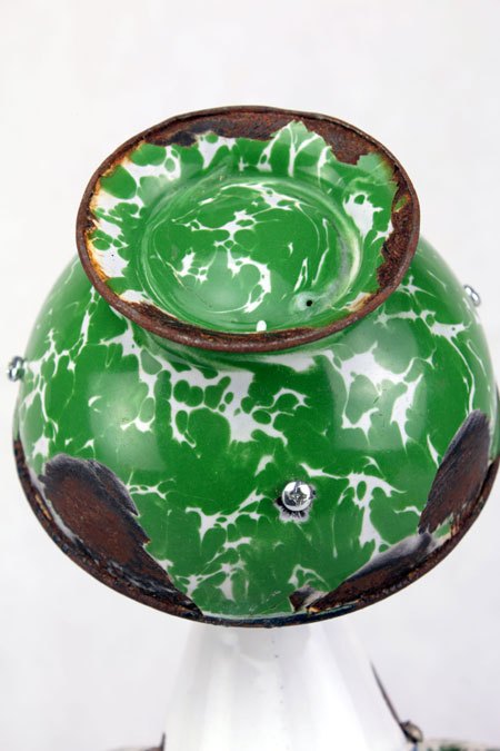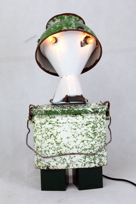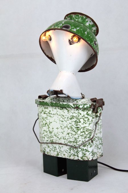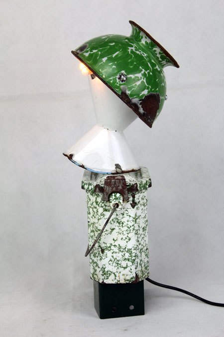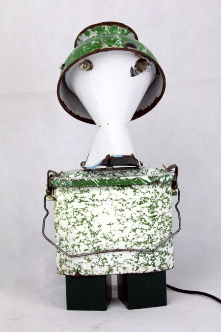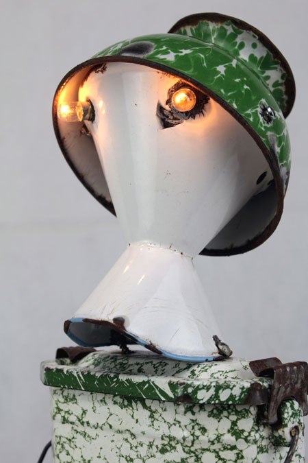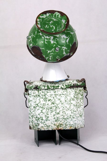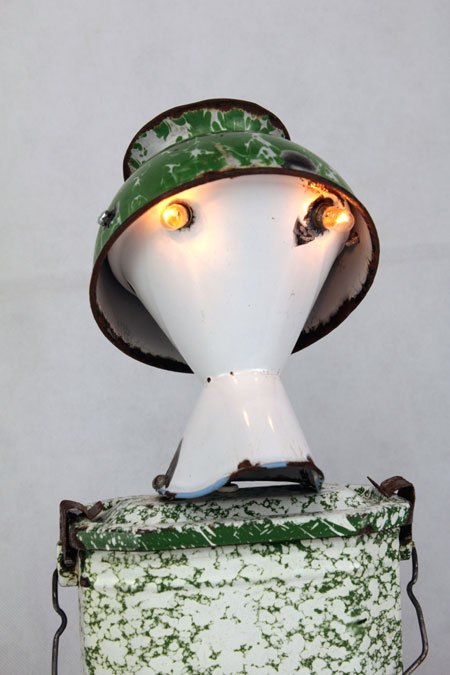 Sculpture robot luminous enamel. enamelled and painted metal. Composition: inhaler, bowl, bowl. white and green. upcycling, assemblageart.