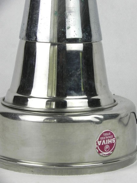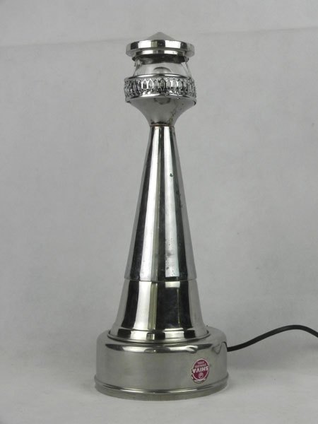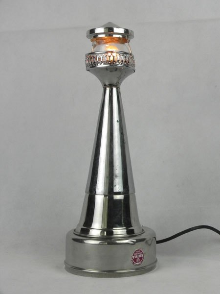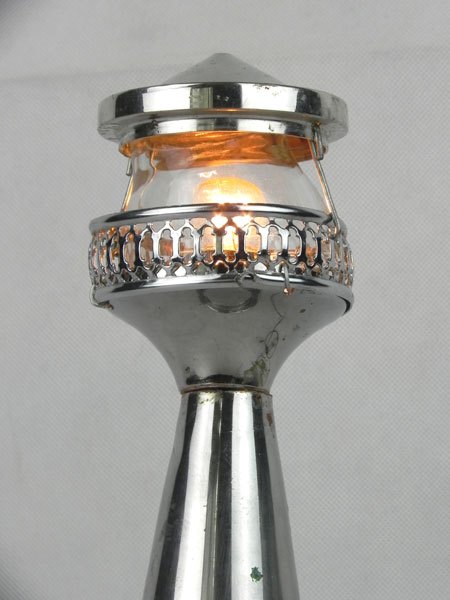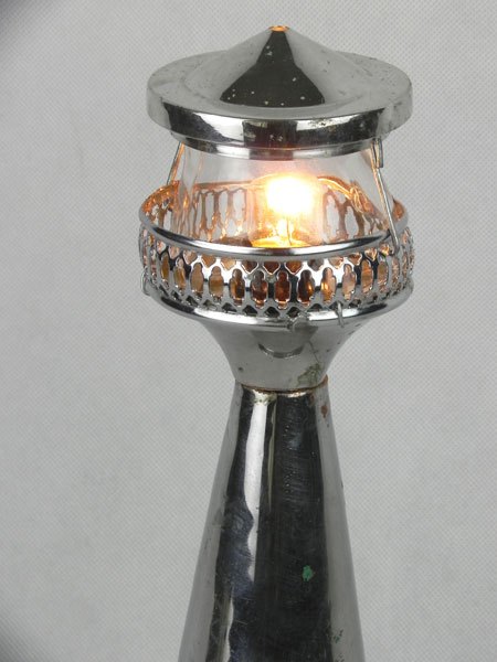Phare en métal chromé. Détournement d’objets: bol, coupe de sport, gamelle, grille, couvercle, verre.
