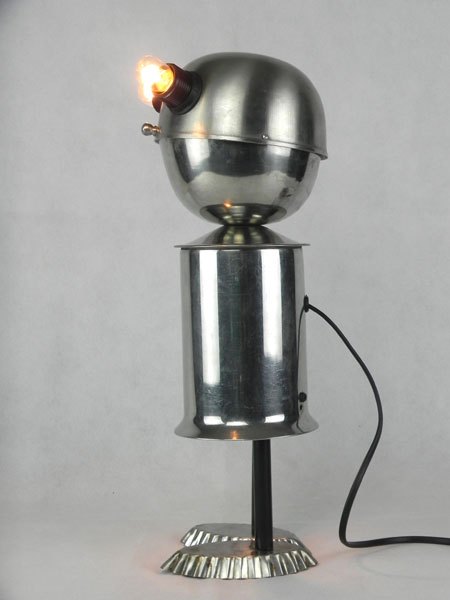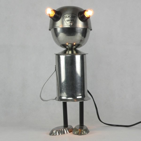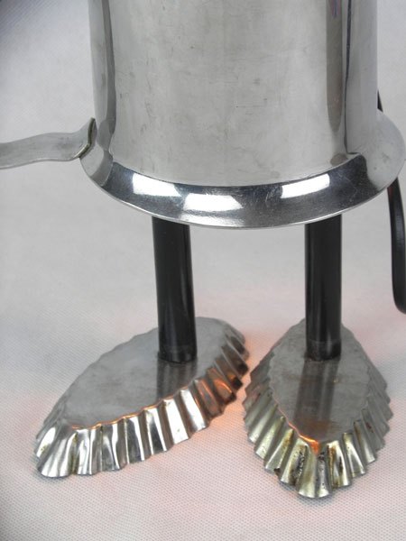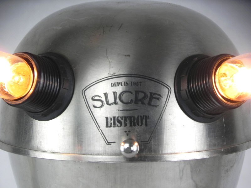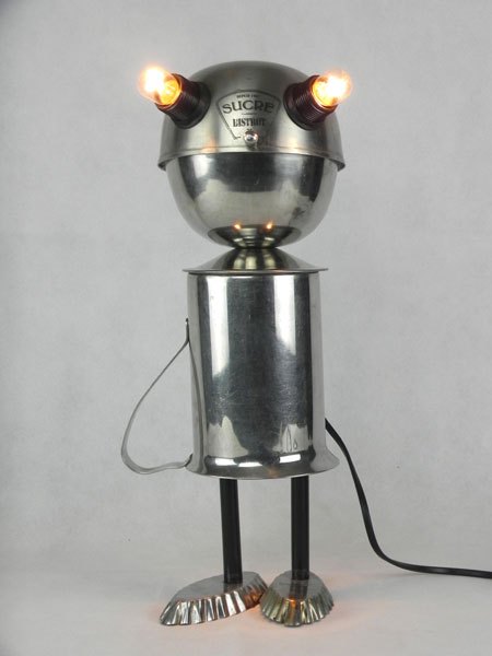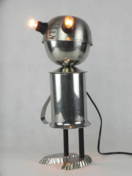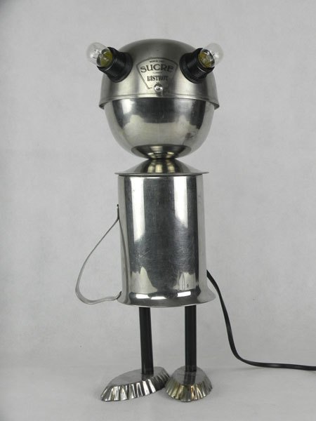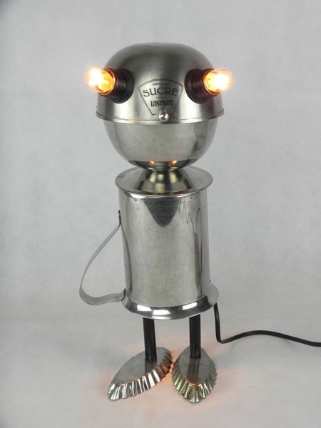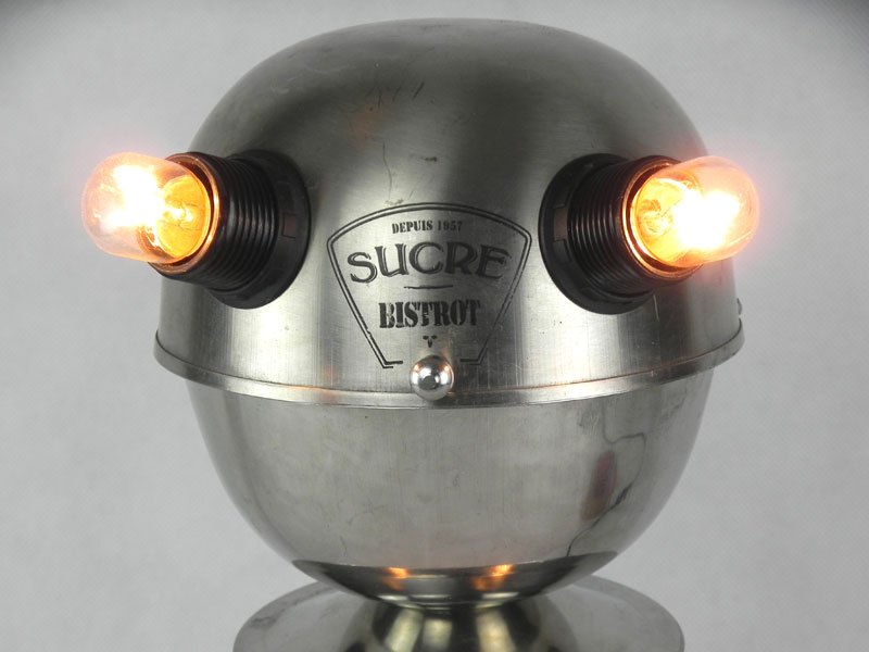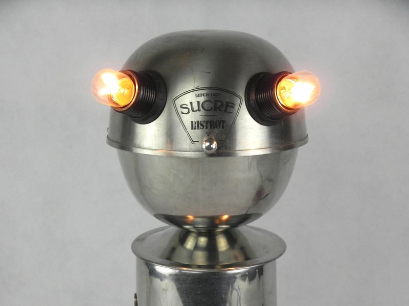 Sculpture robot de collectivité. Assemblage d’un sucrier de bistrot, un broc de cantine et deux petits moules à gâteaux. Inox