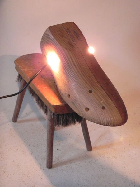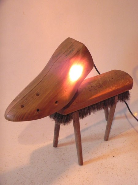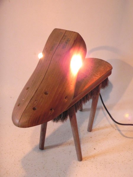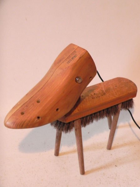 Sculpture détournement d’objets en bois. Assemblage d’un embauchoir, d’une brosse et quatre manches de fourchette à fondue. Sculpture chien, lumière
