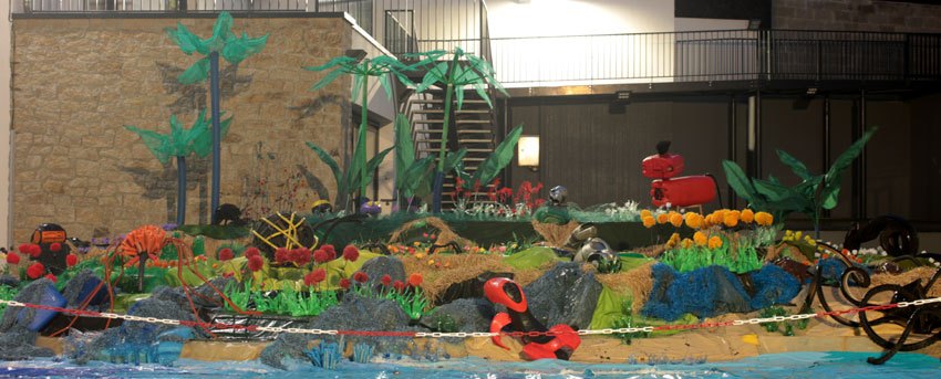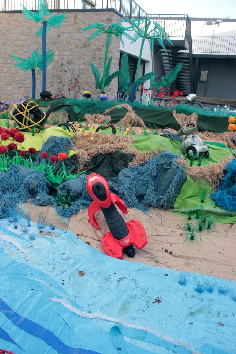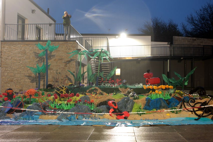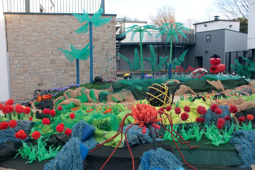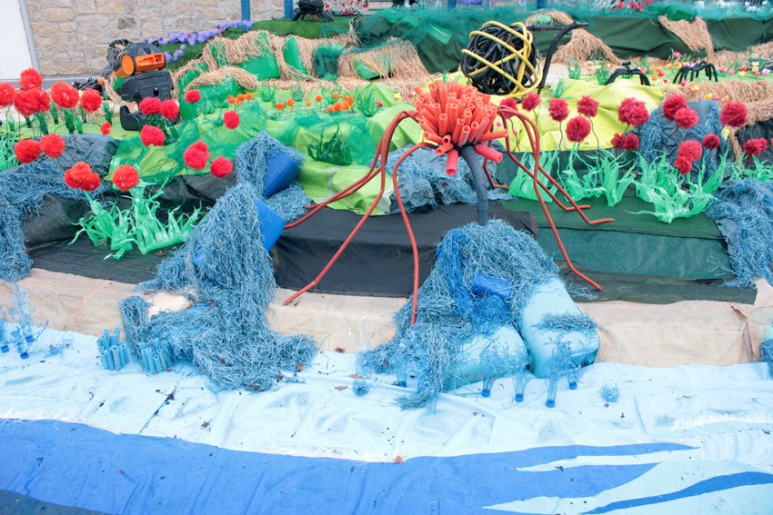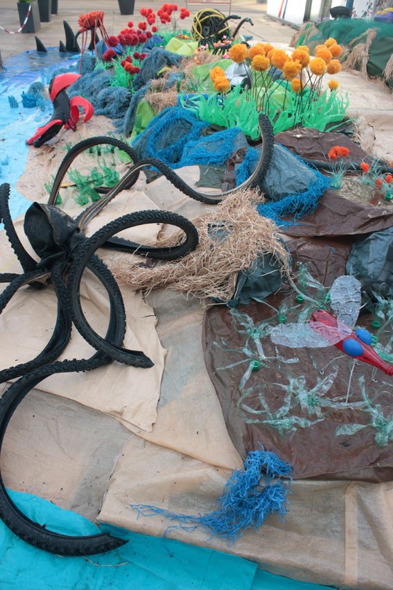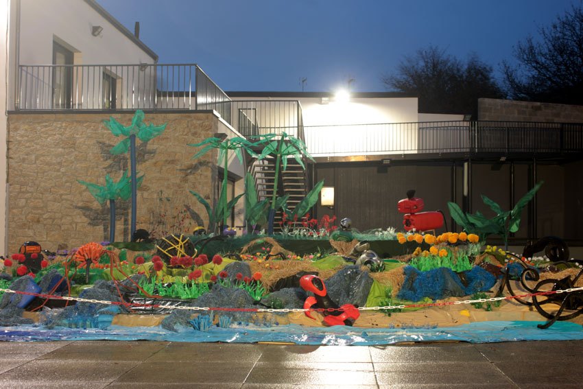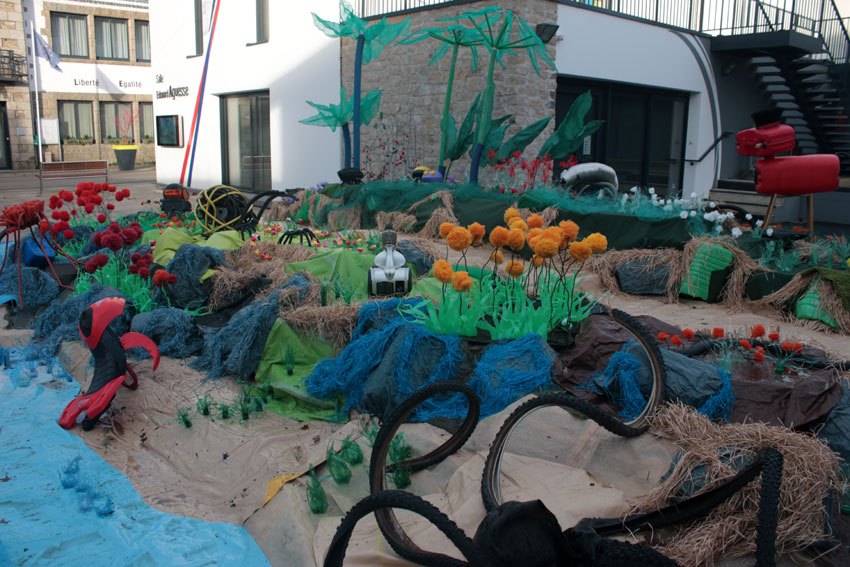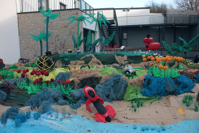 Ce fut l’’occasion d’utiliser des techniques et assemblages développés depuis des années avec les ateliers enfants de bricolage-recyclage, et de les pousser plus loin. Le thème de l’île est un bon prétexte pour aborder tous les éléments de la nature: végétation, l’eau, le sable, les rochers, les fleurs, les herbes, les algues, les animaux, les insectes. C’est un microcosme en déchet, il ne s’agit pas de recréer la nature qui est inimitable mais de s’en inspirer pour essayer de s’en approcher.