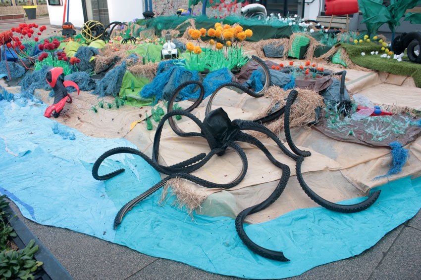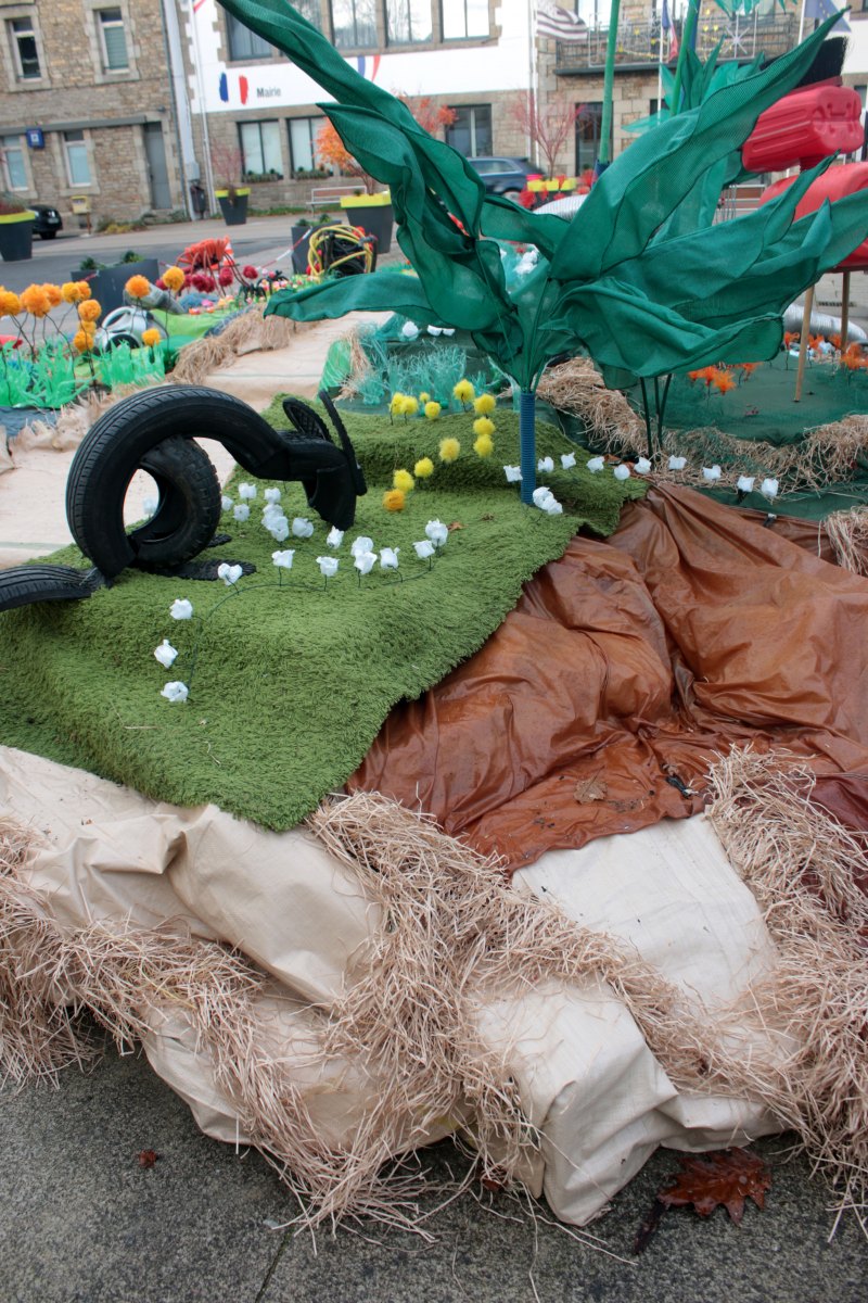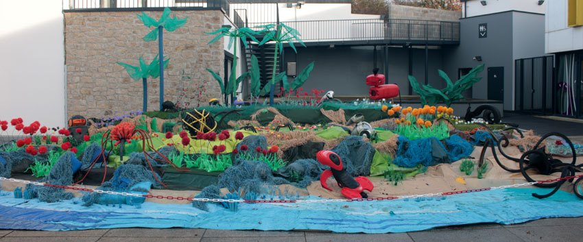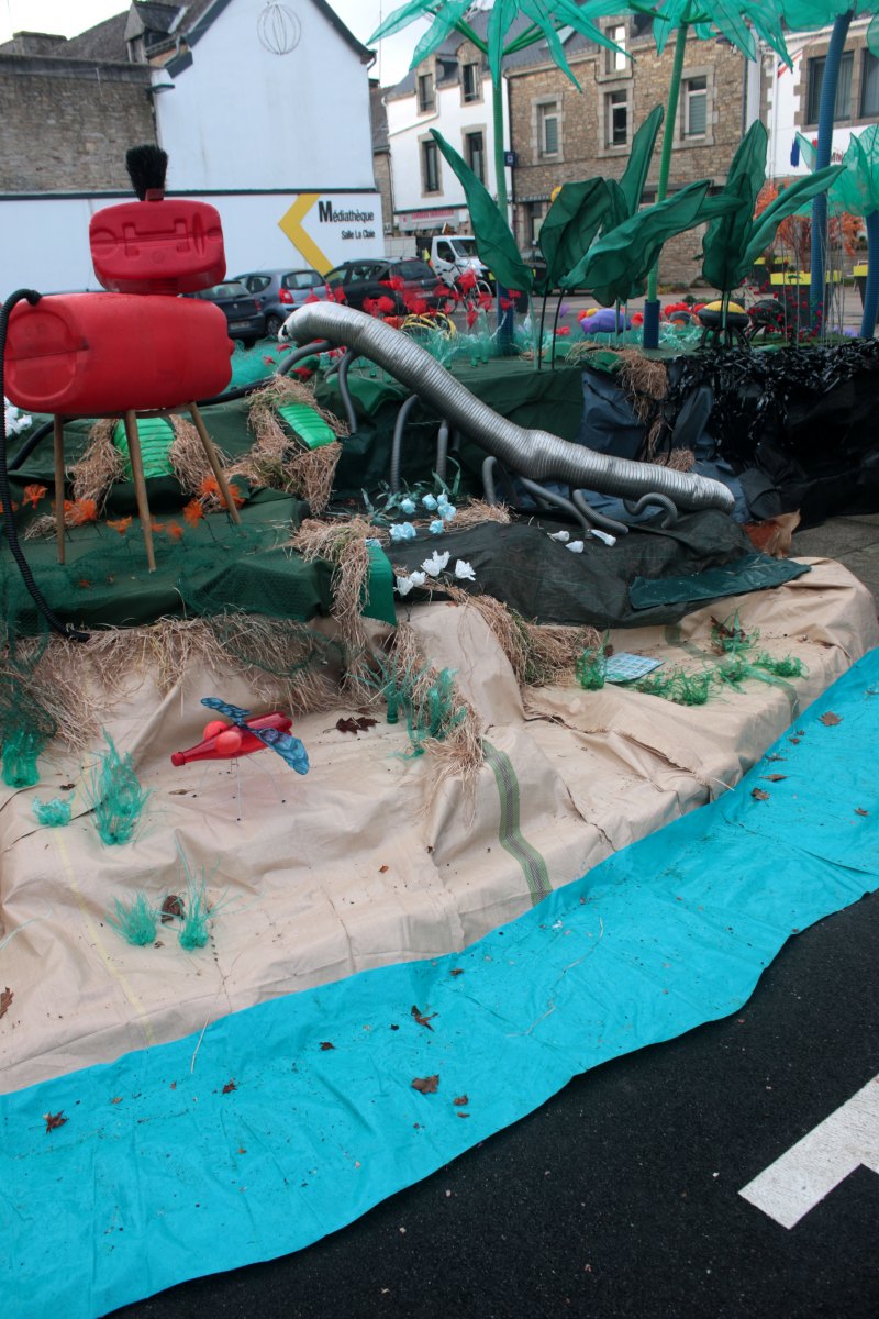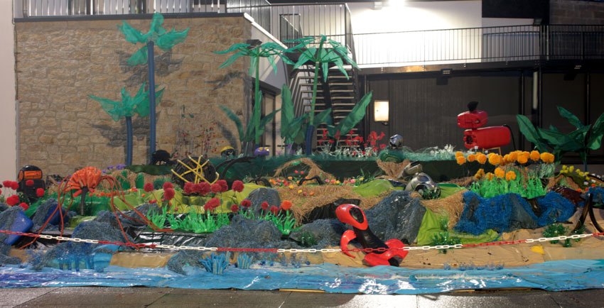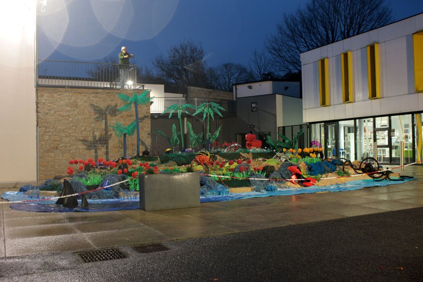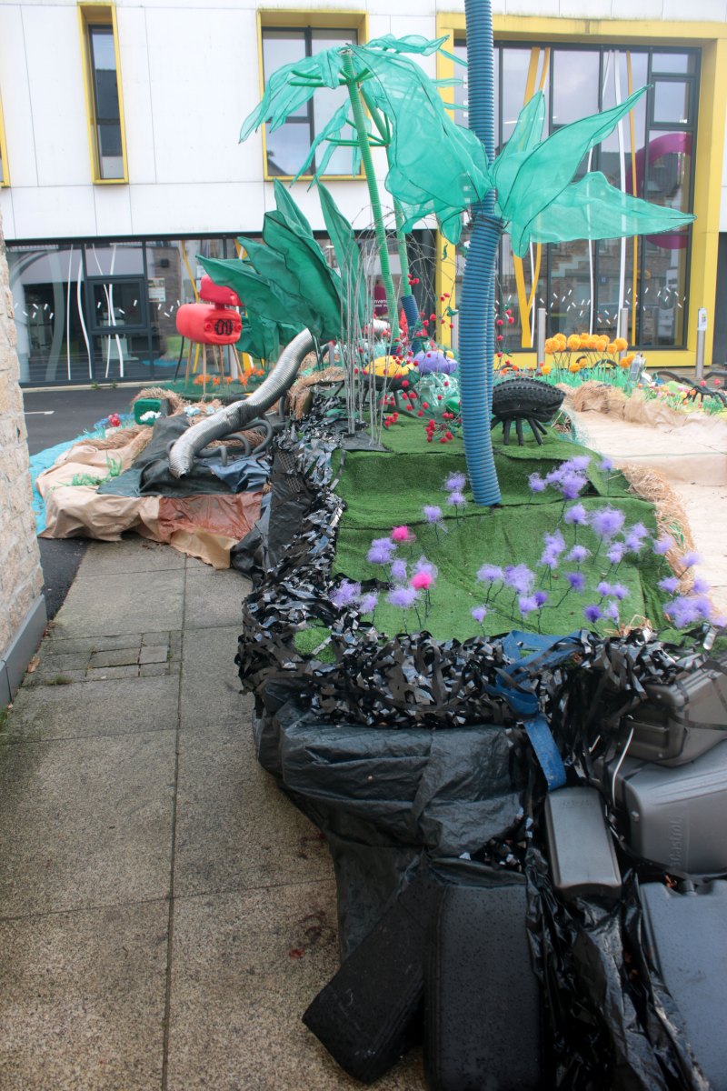 Ce fut l’’occasion d’utiliser des techniques et assemblages développés depuis des années avec les ateliers enfants de bricolage-recyclage, et de les pousser plus loin. Le thème de l’île est un bon prétexte pour aborder tous les éléments de la nature: végétation, l’eau, le sable, les rochers, les fleurs, les herbes, les algues, les animaux, les insectes. C’est un microcosme en déchet, il ne s’agit pas de recréer la nature qui est inimitable mais de s’en inspirer pour essayer de s’en approcher.