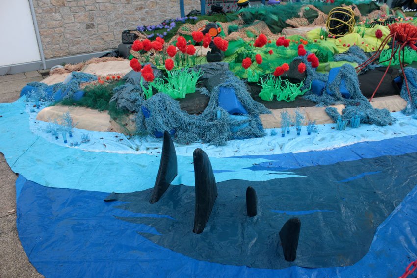 Des bâches bleues complètement explosées, une fois détissées ont permis de faire de belles algues dégoulinantes. Les Bandes VHS fixées au point noué sur du grillage faisaient des algues noires à l’arrière de l’île, malheureusement elles n’ont pas gardé le tombant, vite elles se sont nouées.