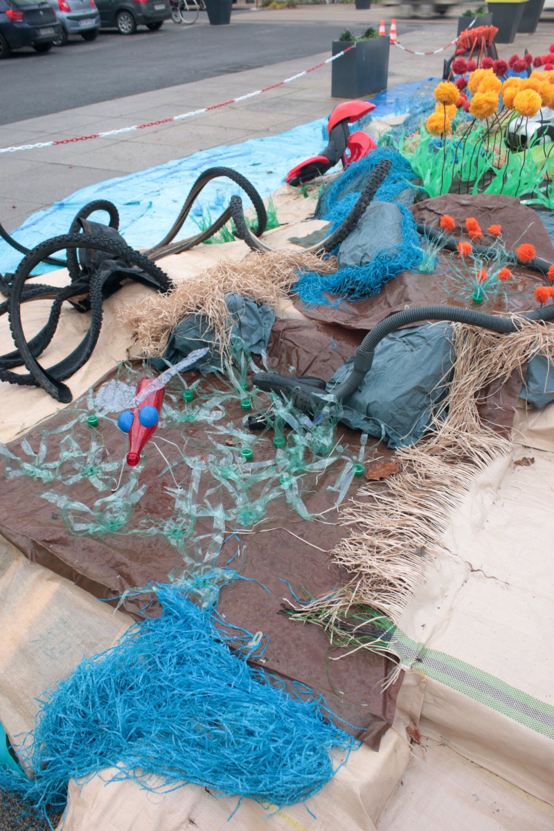 Beaucoup de plastiques ont été utilisés, pour leur couleurs, leur résistance au temps et intempéries. Le paradoxe, ils sont à usage unique malgré tout ça. Les objets récupérés sont géométriques, lisses. Par le détissage, la transformation à chaud, l’accumulation on passe à des matières molles qui s’approchent  de la création naturelle. Les déchets ne sont pas cachés mais transformés ou recomposés.