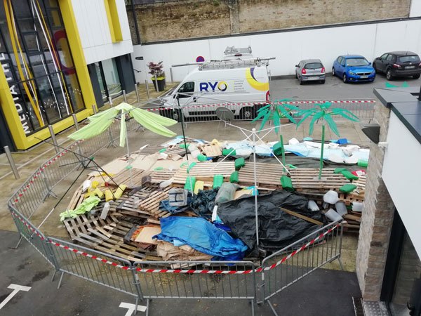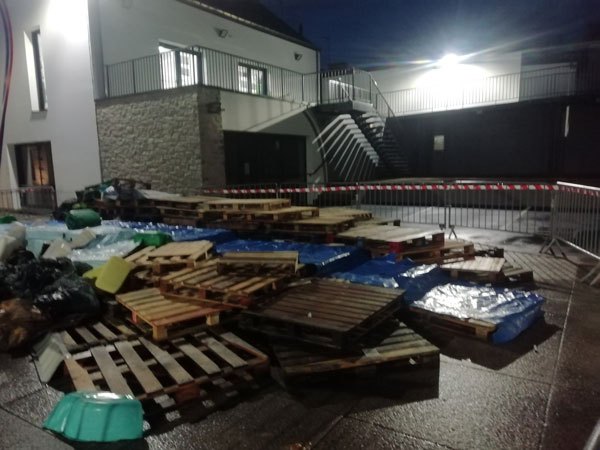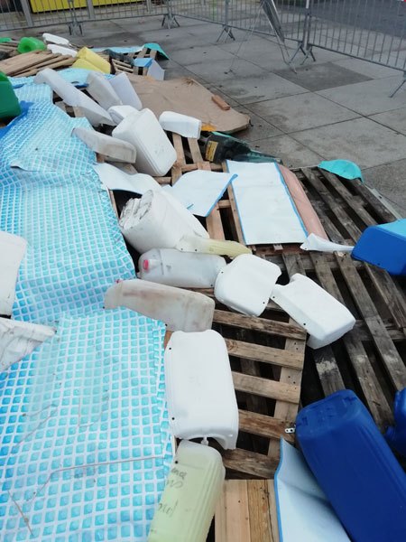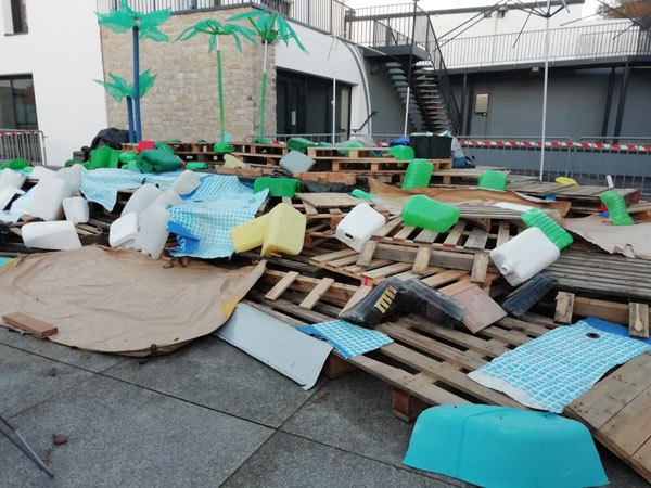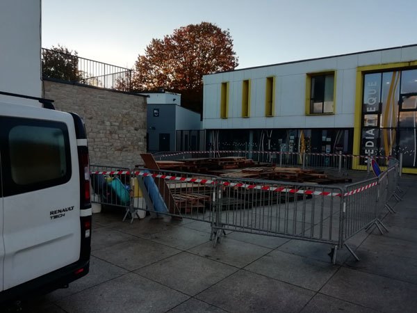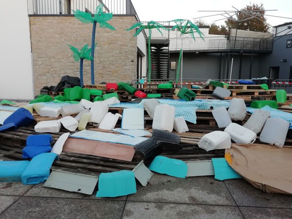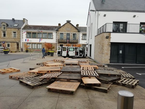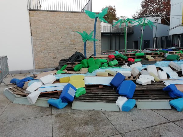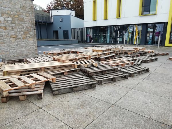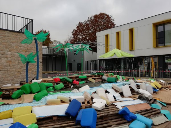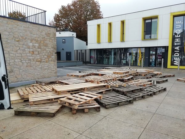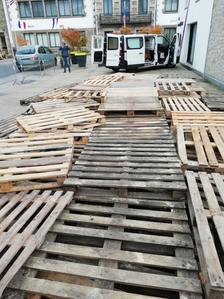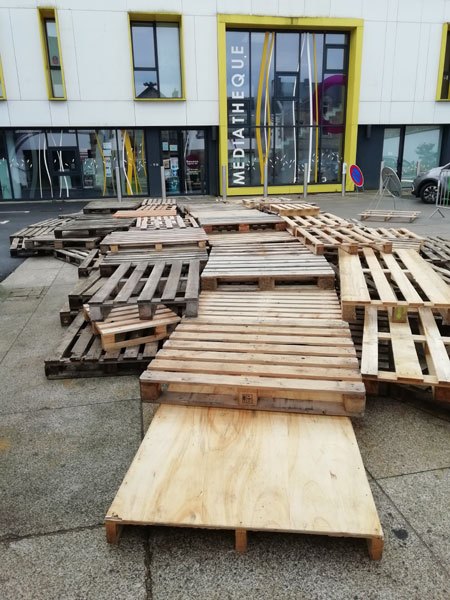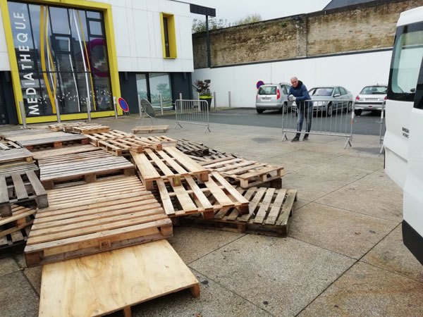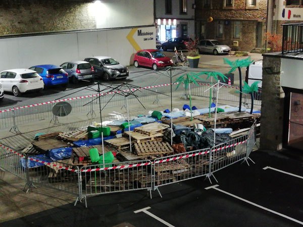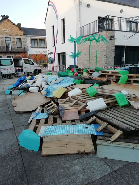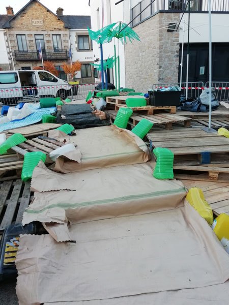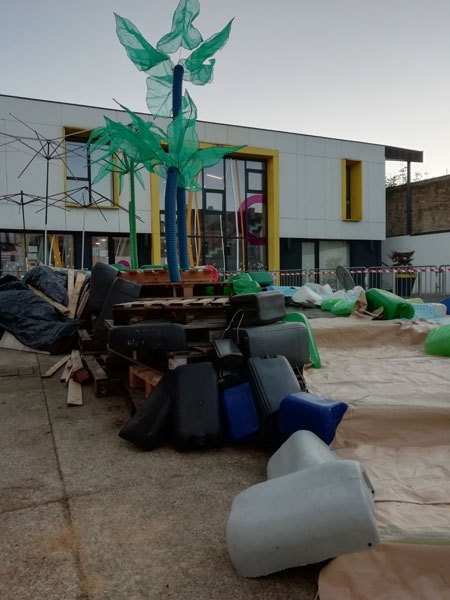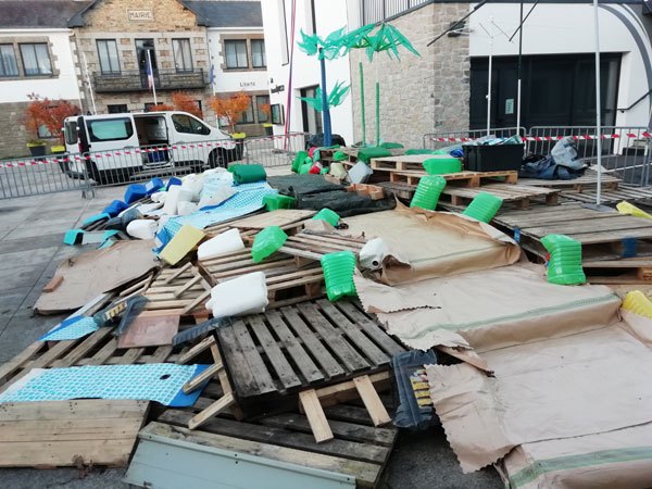Construction de l’installation « la 60 eme île », du 1er au 26 novembre 2021. Assemblage de matériaux récupérés auprès des entreprises locales, des déchetteries du secteur, des habitants. Performance de recyclage.