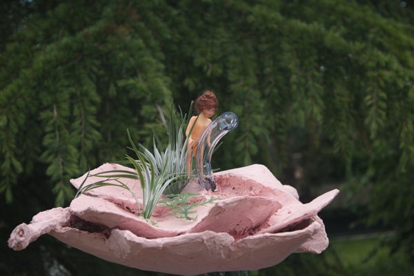 Dans le Jardin des plastiques tout est récupéré, les objets ont tous une histoire et un passé : ils viennent directement de matières naturelles, ainsi que de l’atelier de l’artiste qui fait depuis des années une étrange collection des marchandises dont on n’a plus voulu dans nos maison, et des ses déchets personnels. Ces objets et matières sont ensuite bidouillés, assemblés, modifiés. Les oiseaux du panneau central ont fait place à des petits chiens en plastiques. Les architectures oniriques à des pots en verre venant des cuisines de mamie… Penchez-vous et comparez : tout ce qui est dans le tableau se retrouve réinterprété avec minutie et tendresse dans l’installation.