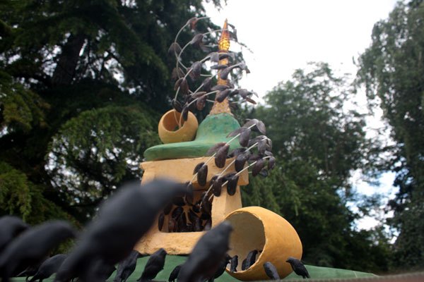 L’œuvre d’Angèle Riguidel s’est faite à plus de deux mains : les siennes d’abord, suivant celles de Jérôme Bosch, celles de dame Nature, les mains également ce ceux qui avaient fabriqué les objets préexistants maintenant insérés dans l’installation, mais celles aussi des personnes ayant participé à l’atelier de bricolage proposé pour l’exposition. Les chimères que vous voyez ont de multiples paternités / mInstallation sculptures.aternités.