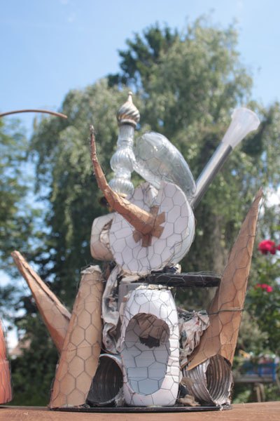 L’œuvre d’Angèle Riguidel s’est faite à plus de deux mains : les siennes d’abord, suivant celles de Jérôme Bosch, celles de dame Nature, les mains également ce ceux qui avaient fabriqué les objets préexistants maintenant insérés dans l’installation, mais celles aussi des personnes ayant participé à l’atelier de bricolage proposé pour l’exposition. Les chimères que vous voyez ont de multiples paternités / mInstallation sculptures.aternités.