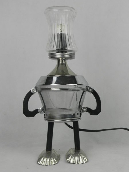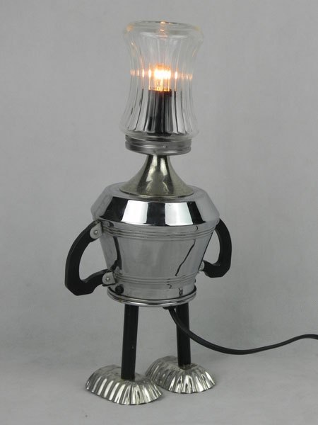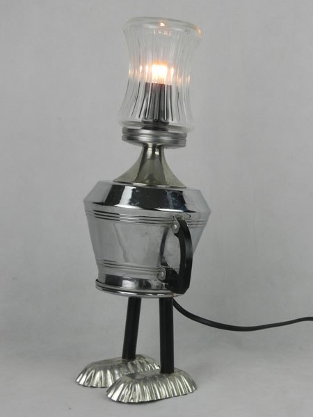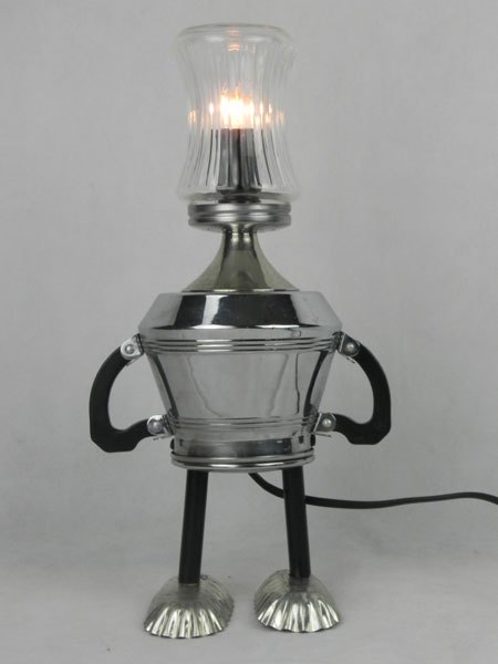 Personnage lumineux sucrier, service à café et mini moules. Assemblage de verre, métal chromé, bakélite, inox et acier. Recyclage lumineux, détournement.