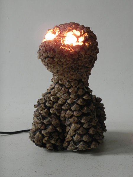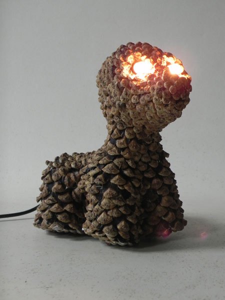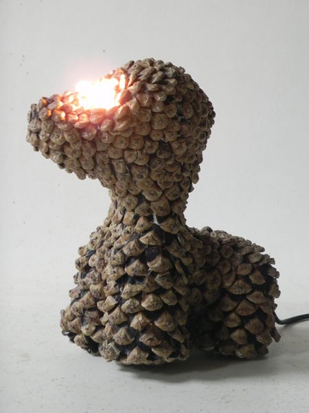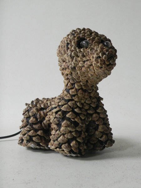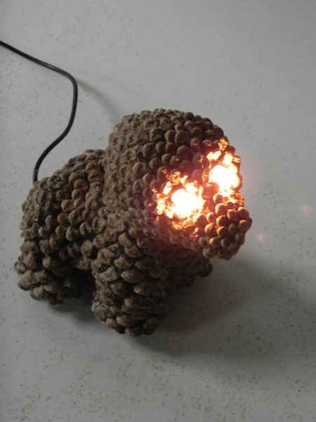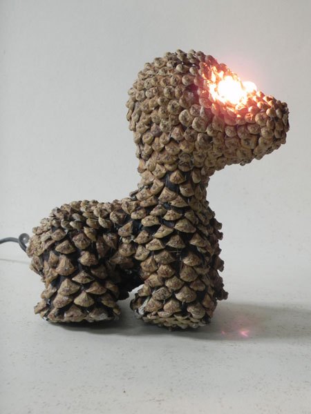 Chien lumineux en pommes de pin recomposées.