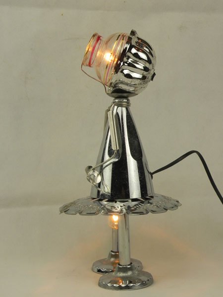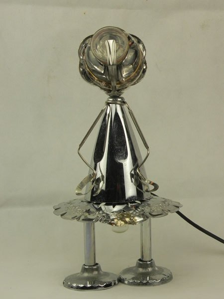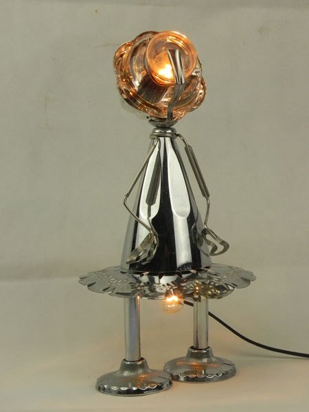 Sculpture assemblage lumineux métal. Composition: coupe de sport, coupe en verre, supports de porte serviettes, assiette de présentation, pince à escargot.