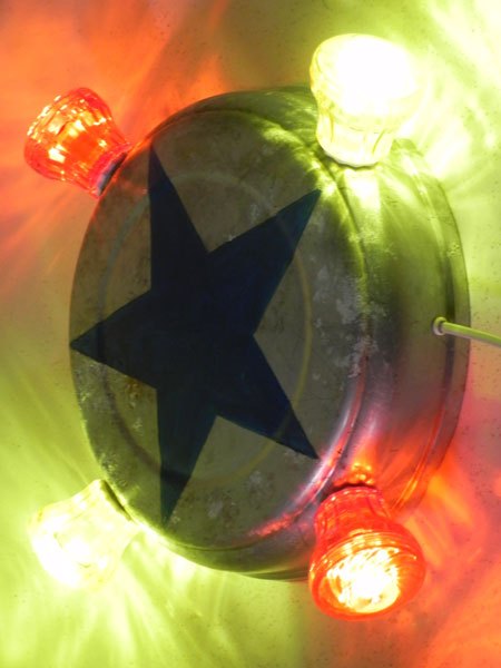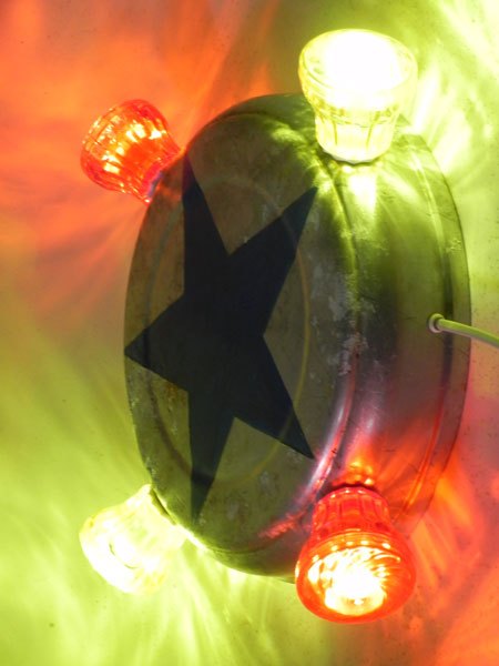 Applique fête foraine, étoile bleu peinte sur une gamelle en aluminium, ampoules de fête foraine rouges et jaunes.