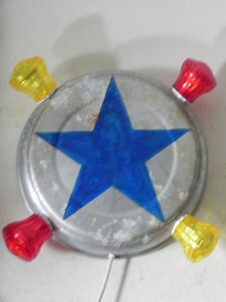 Carnival wall light, blue star painted on an aluminum bowl, red and yellow carnival light bulbs.