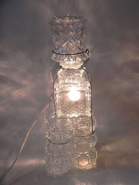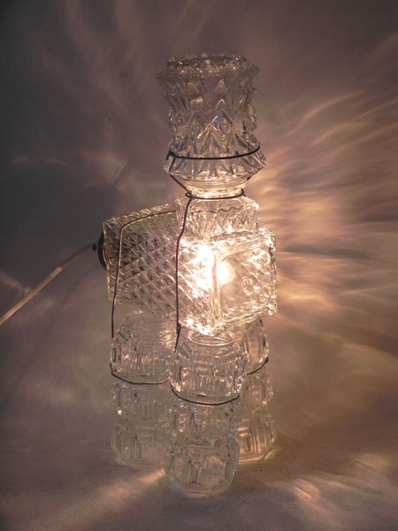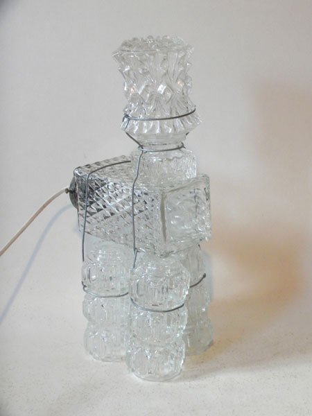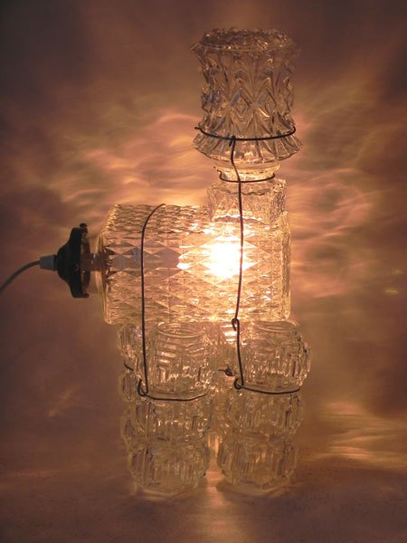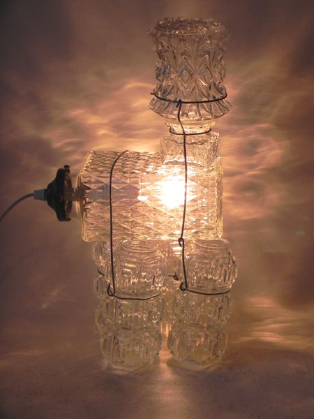 Sculpture animal avec verrerie, détournement 5 verrerie d’éclairage et un flacon à whisky. Lampe à 4 pattes.