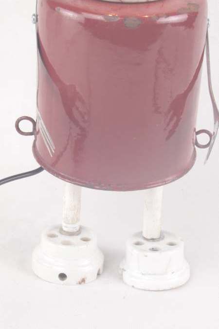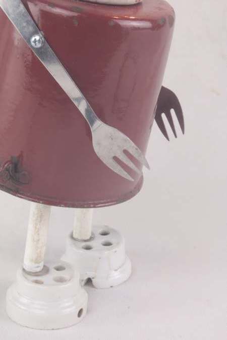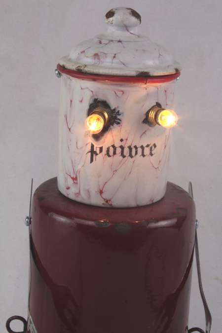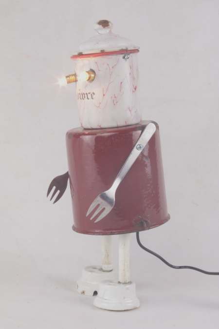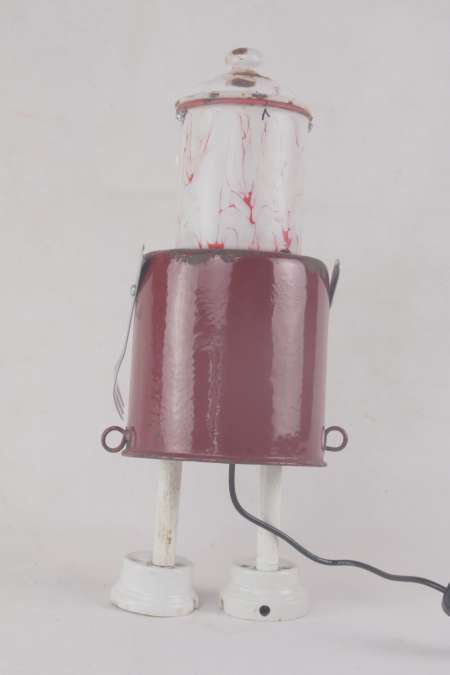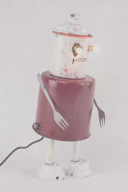 Année de création: 2026 Dimensions : 32 x 13 x 13 cm Poids : 0.8 kg Alimentation : 12 V 2xE10 Matières : Email, porcelaine, inox Description : Assemblage de boites en émail, fourchette, prises en porcelaine et tubes.