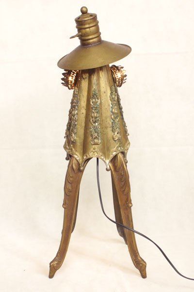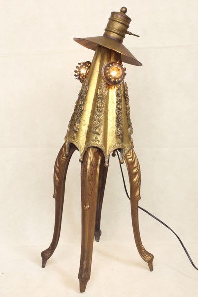 Octopus lamp sculpture in brass. Assembly of an umbrella stand and 4 table feet. Diversion of objects, antique, art. kraken.