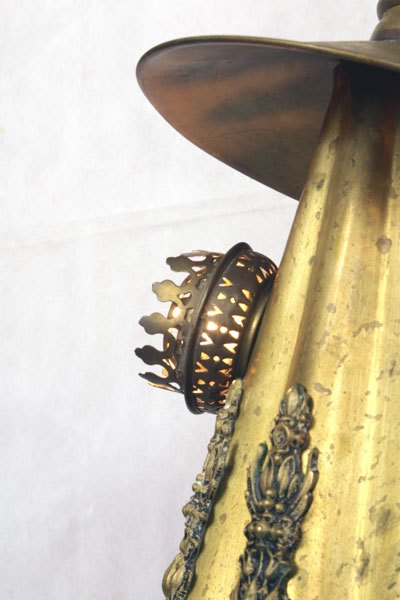 Composition: porte parapluie, abat jour, pied de table, 2 becs de lampe à pétrole.