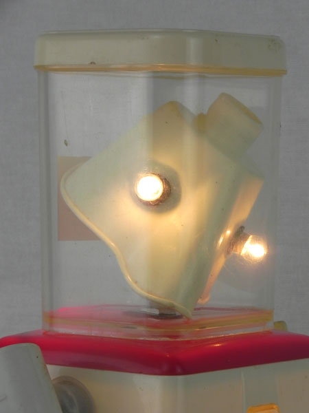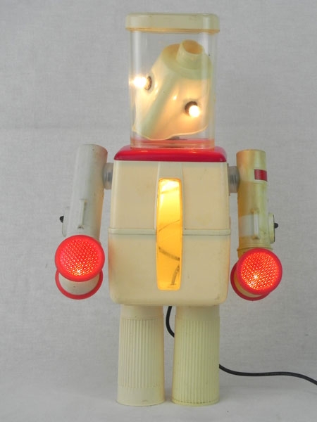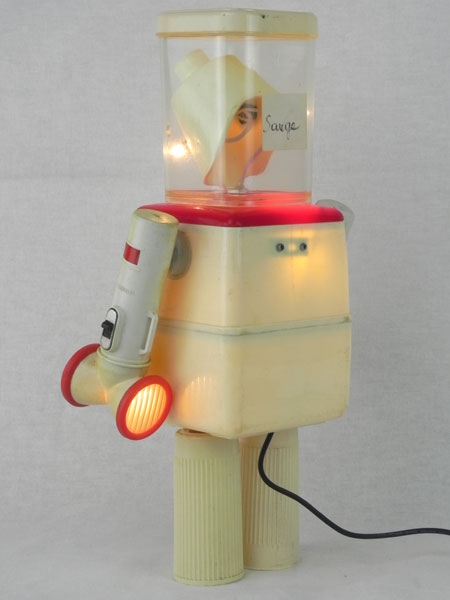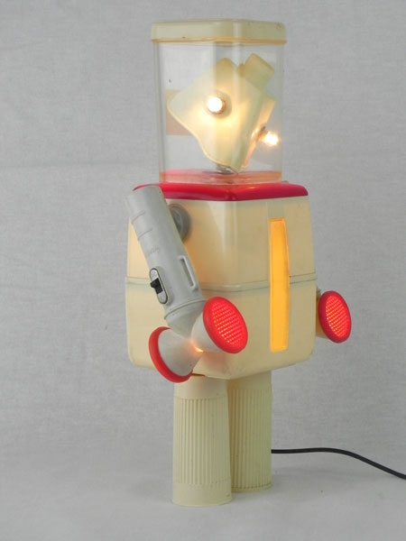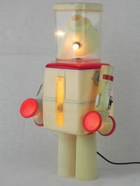 Robot boites détournées lumineux. Assemblage de 2 pots, 2 lampes de poche, 2 inhalateurs, masque d’inhalation. Crème et rouge.