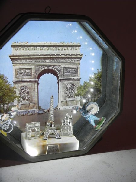 Composition in a cake box la Caennaise. metal box printed Arc de Triomphe, lead character, brass band, cyclist and Parisian plastic monuments.