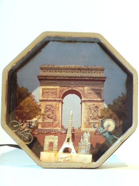 Composition: boite en métal imprimée, personnage en plomb, monuments parisiens en plastique .