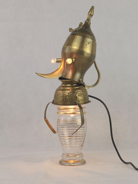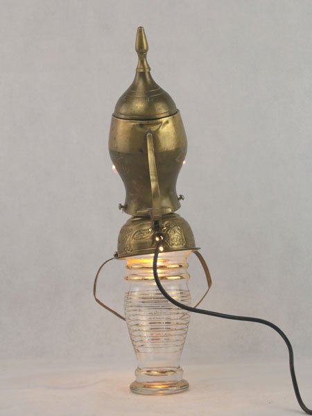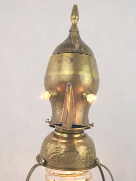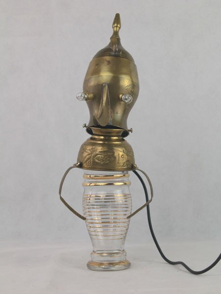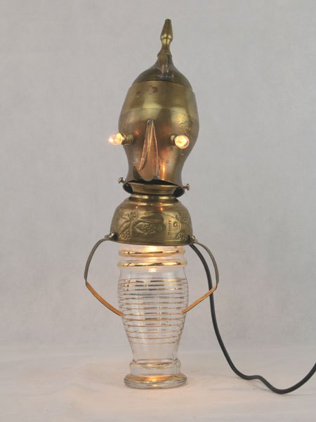 Sculpture personnage assemblage laiton et verre. Composition: théière, bol, vase, anse. Détournement d’objets, antiquité, art populaire.