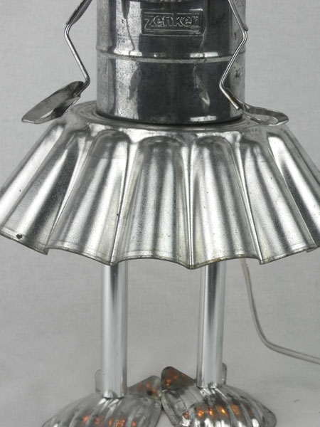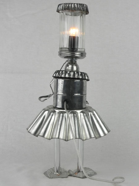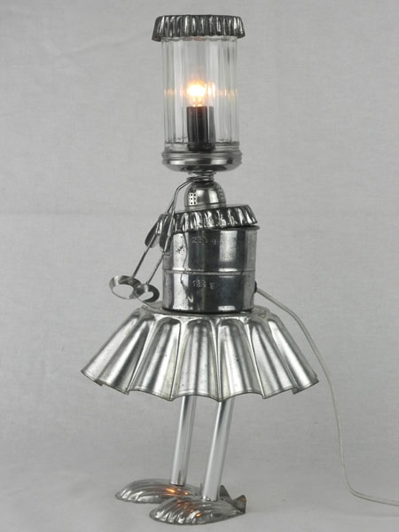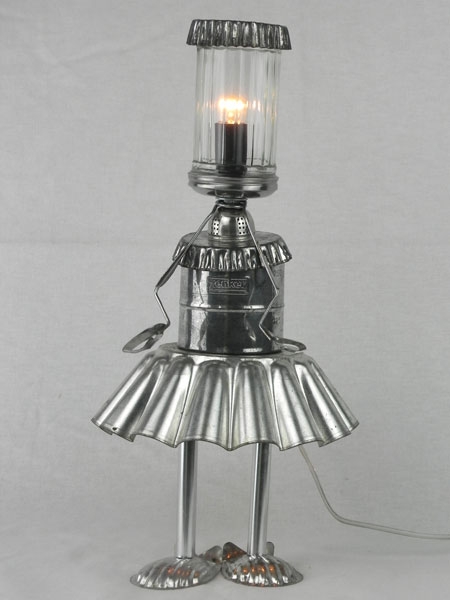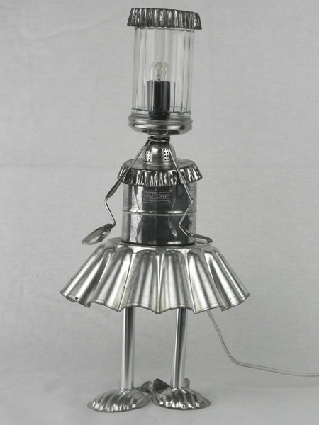 Sculpture ustensiles de cuisine. Assemblage: moules à tartelettes, sucrier, moule à gâteau, 2 mini moules, pince à escargot, fer blanc,