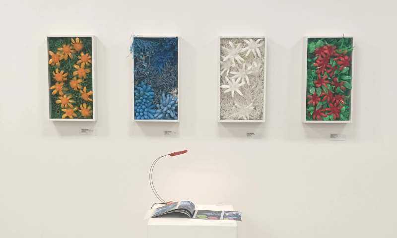 Pascale Ract utilise des rebuts d’activités industrielles, artisanales ou domestiques comme matière première pour de très aériennes sculptures ou installations. Maëlle de Coux exploite les laissesmarines récoltées sur l’estran, qu’elle brode pour nous livrer des paysages oniriques ou fantastiques. Laurence Aellion transforme des déchets de matières plastiques, potentiellement polluants, en splendides proliférations coralliennes. Laurent Gongora détourne et hybride des matériaux de récupération pour nous livrer de nouvelles espèces végétales ou animales qui nous surprennent et nous déstabilisent. Angèle Riguidel nous propose une brocante ou les rayons d’une improbable quincaillerie avec des assemblages hybrides composées de fragments d’objets collectés dans des déballages de choses devenues inutiles ou dans des vide-greniers…