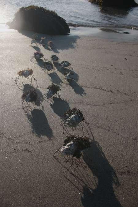 Cette proximité avec le cycle de vie des huîtres m’a invitée à utiliser les coquilles d’huitres qui terminent généralement dans les poubelles des consommateurs, elles sont devenues la base d’une série d’assemblages  « An Istr » (huître en breton).