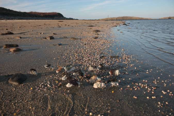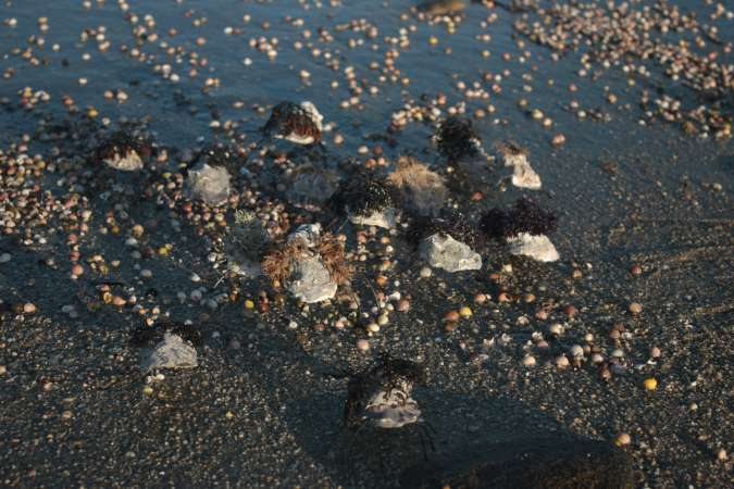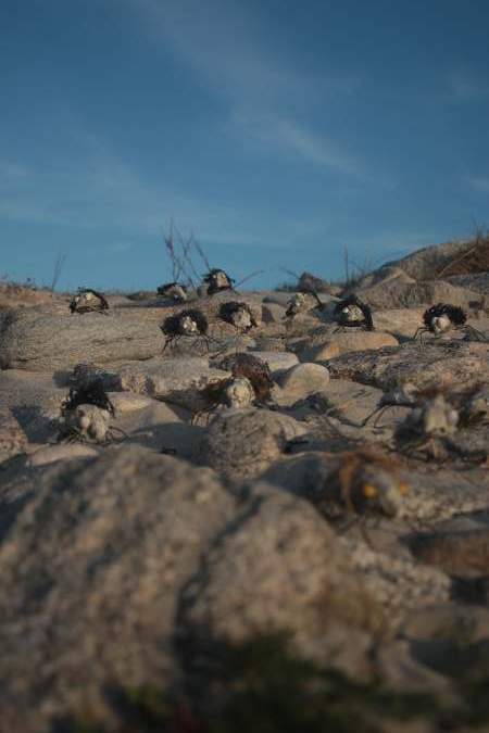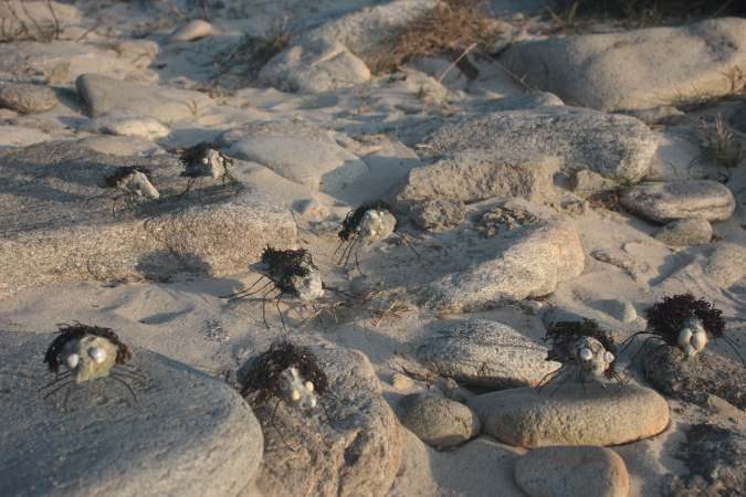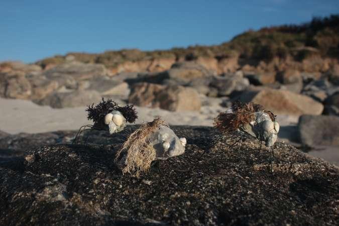 À la suite du projet « Déchets Sauvages », cette résidence sur l’île Wrac’h a constitué un véritable contraste. En deux semaines, je n’y ai ramassé que trois petits morceaux de plastique et un fragment de métal. Les plages y sont étonnamment propres : chacun prend naturellement soin de l’environnement en ramassant les déchets laissés par l’humain. Sur l’île, rien n’est véritablement un déchet : bois flotté, coquilles, végétaux secs, cadavres… tout s’intègre dans le cycle naturel, chaque élément a sa place, sa fonction, sa temporalité.