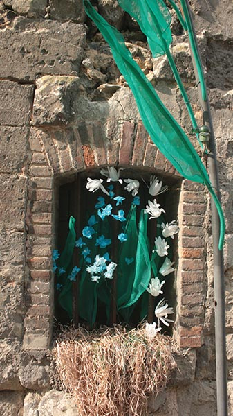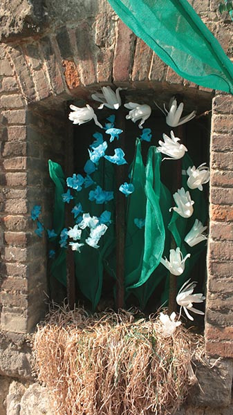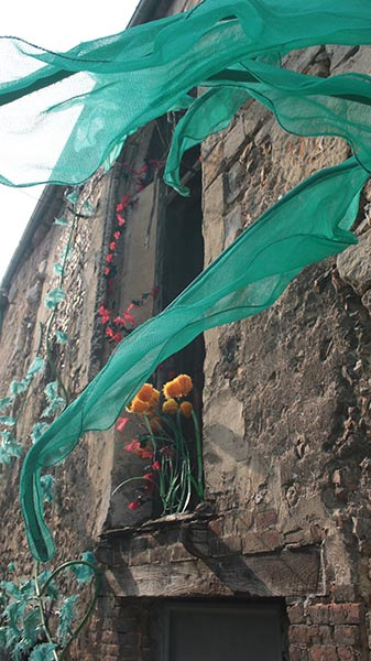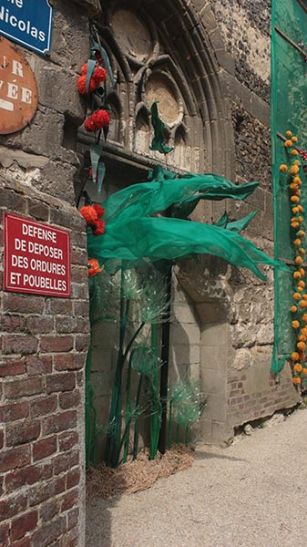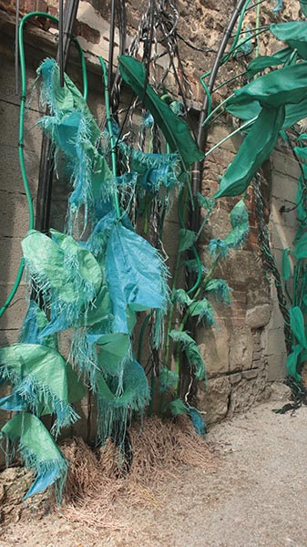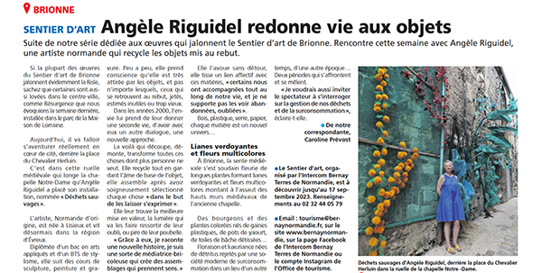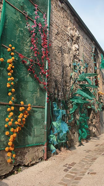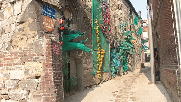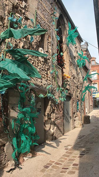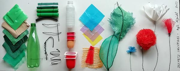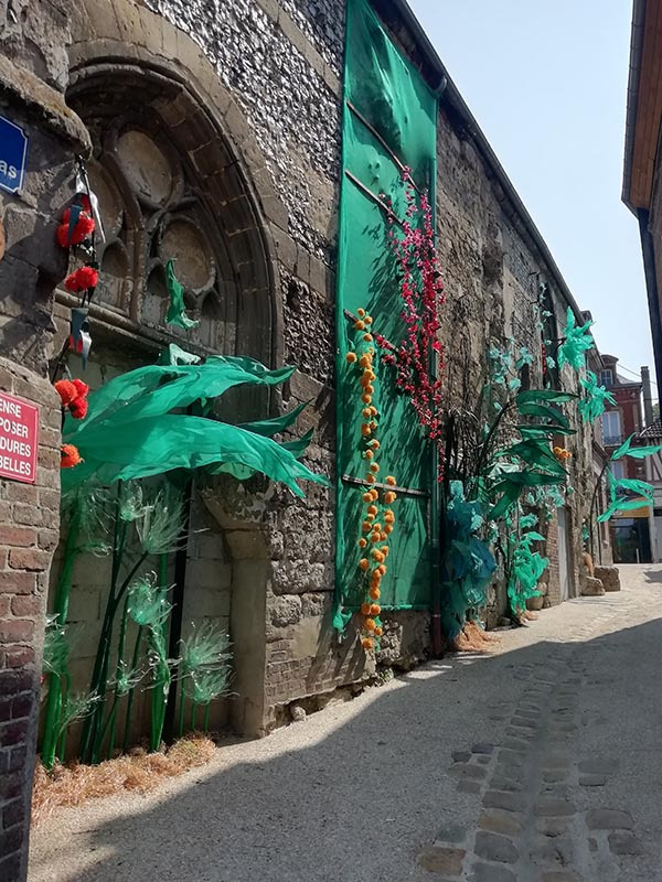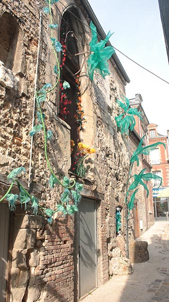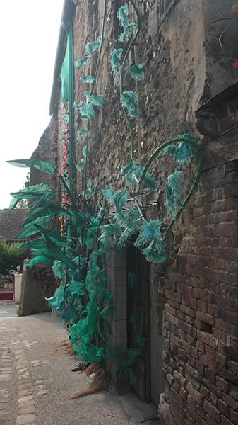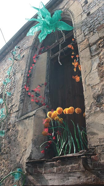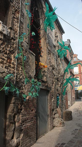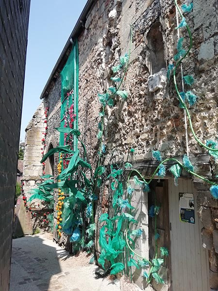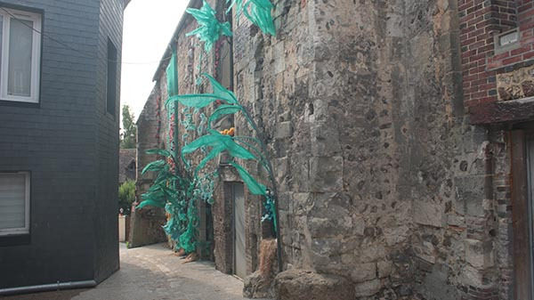 « Son œuvre in situ s’intitulant « Déchets sauvages » consiste à y « planter » une végétation luxuriante et colorée créée à partir de déchets du quotidien. Plantes grimpantes fleuries par des pots de yaourt déformés, arbustes sauvages réalisés par des toiles de bâches détissées, fleurs en filets de légumes et herbes folles en gaines de câbles plastiques viendront valoriser le patrimoine architectural de la ruelle. Cette installation propose une « fenêtre sur » le patrimoine bâti de Brionne, une balade botanique insolite, en miroir avec la flore réelle afin d’apprécier la biodiversité, tout en invitant le spectateur à s’interroger sur la gestion de nos déchets et sur la surconsommation. »