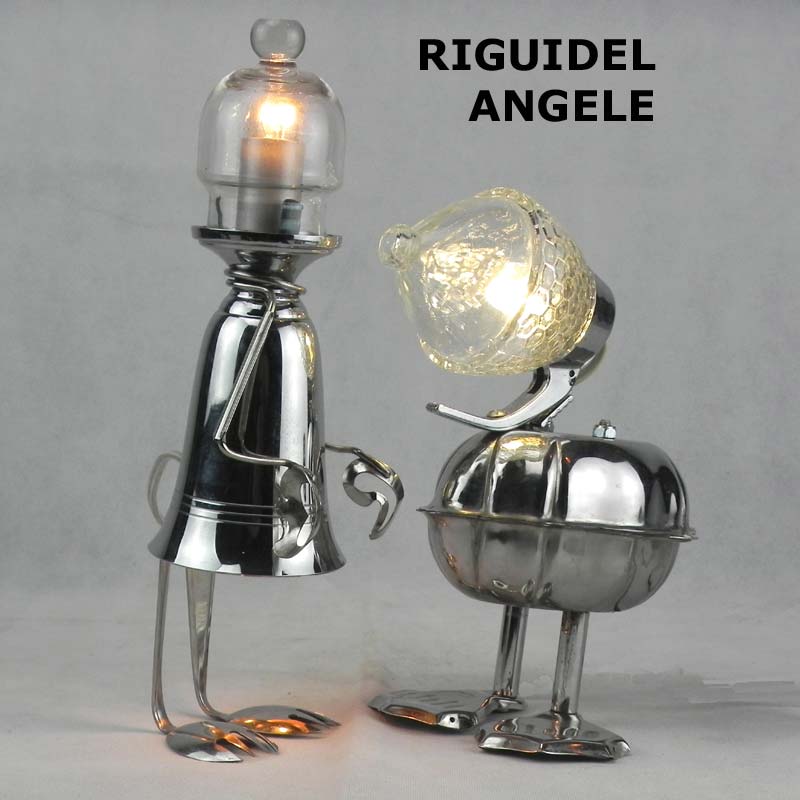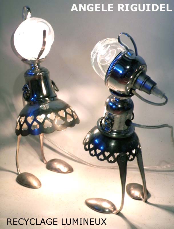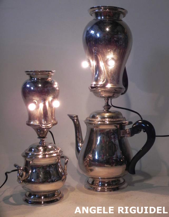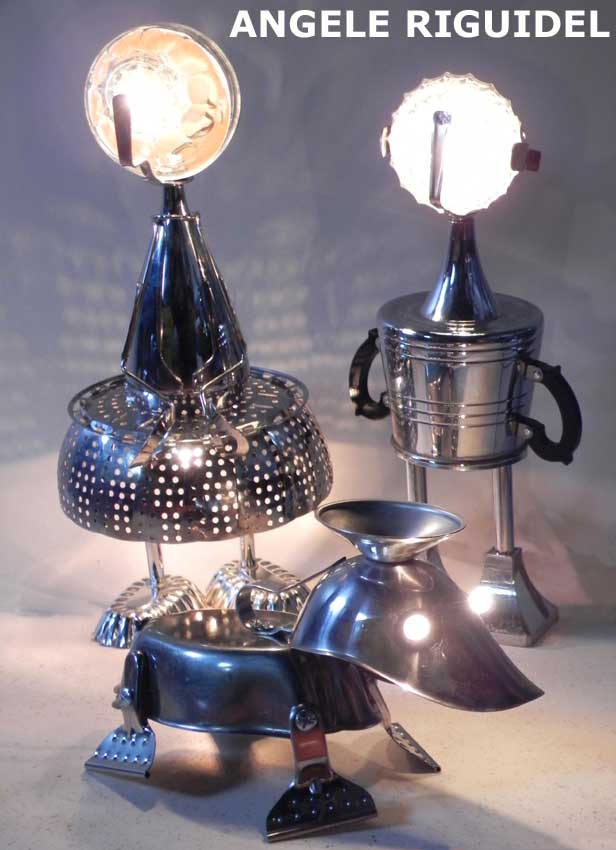 Sculptures assemblage d’objets. Robots lampes en inox. bouilloires, coupe de sport, gamelle, couvercle, pince à trancher, sauciers, poignées.