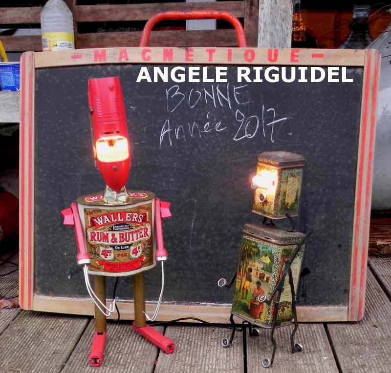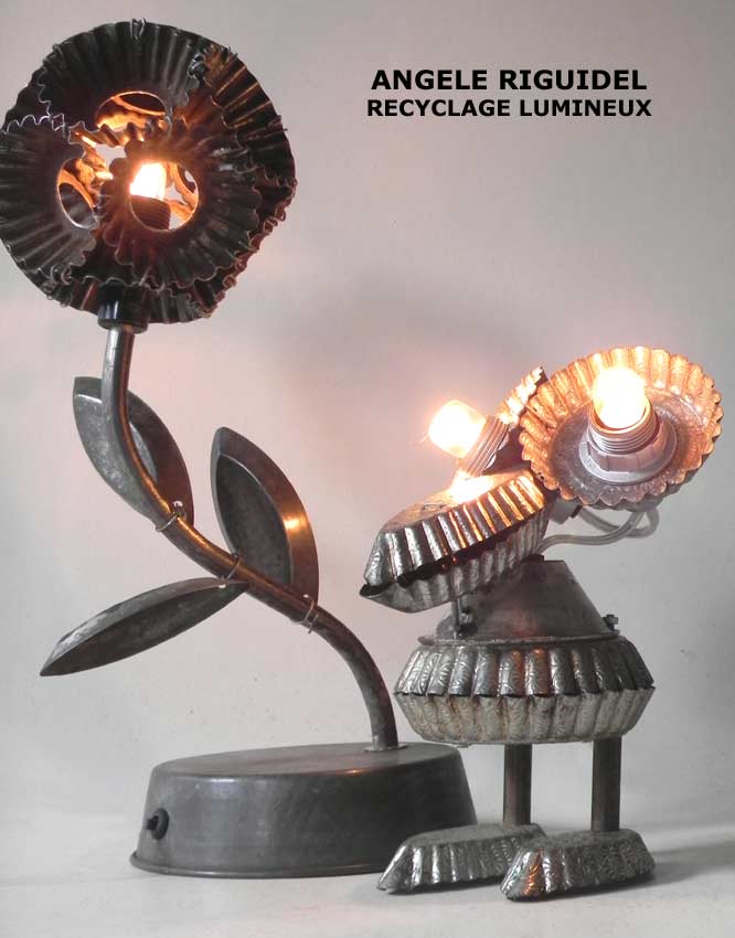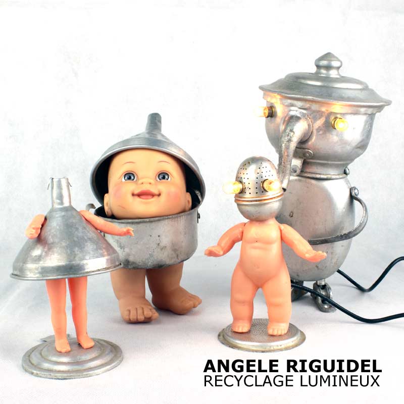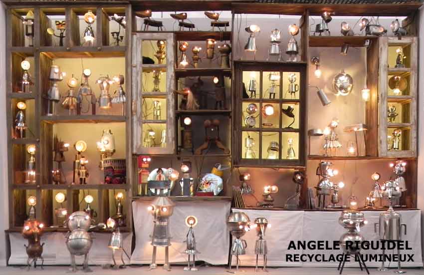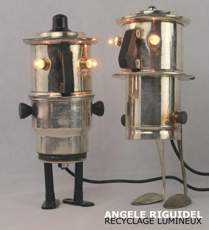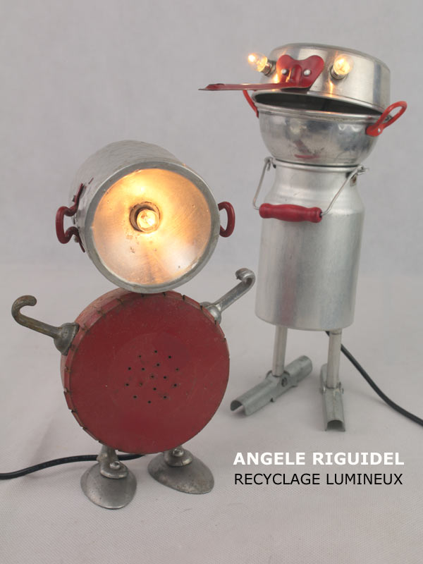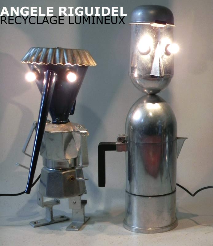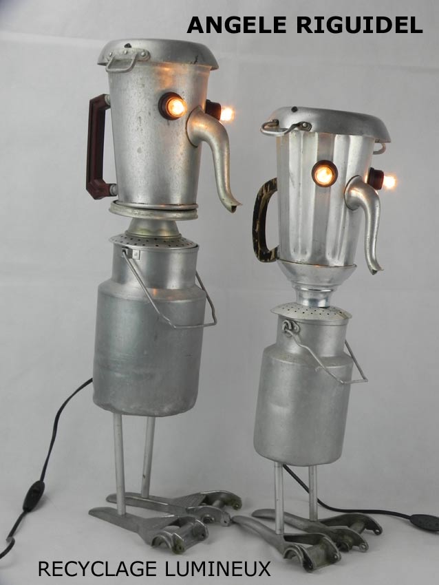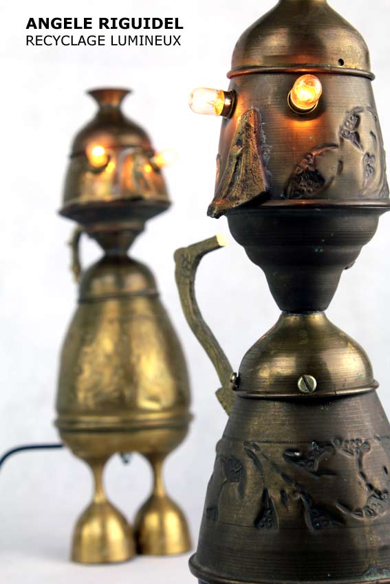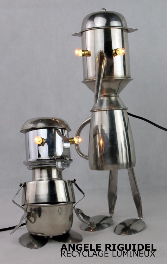 Sculptures assemblage d’objets. Robots lampes en aluminium. bouilloires, coupe de sport, cafetière, gamelle, poignées, cuillères.