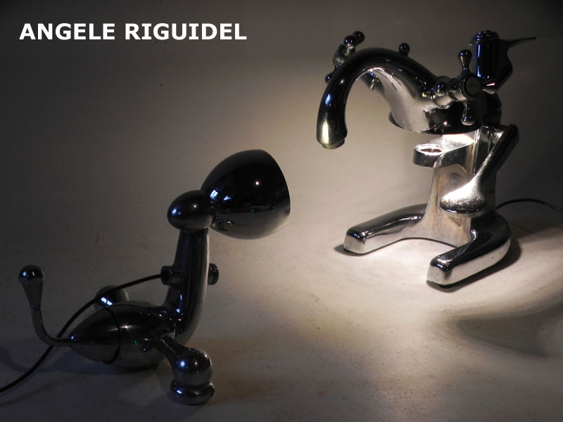 Sculptures assemblage d’objets de plomberie. Robots lampes en fonte chromée.