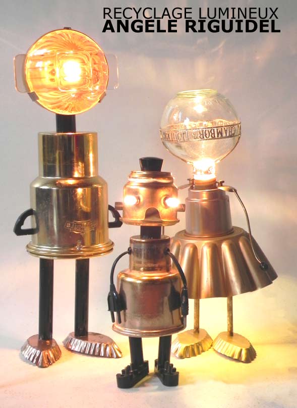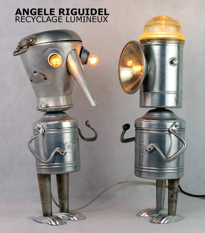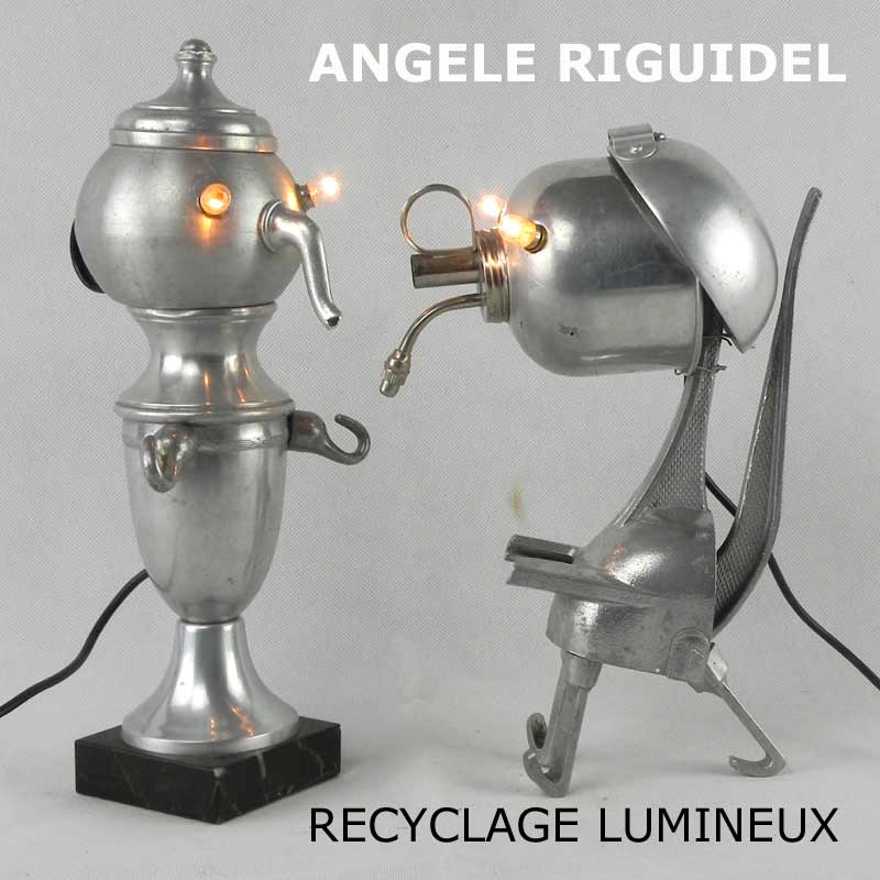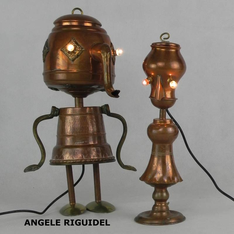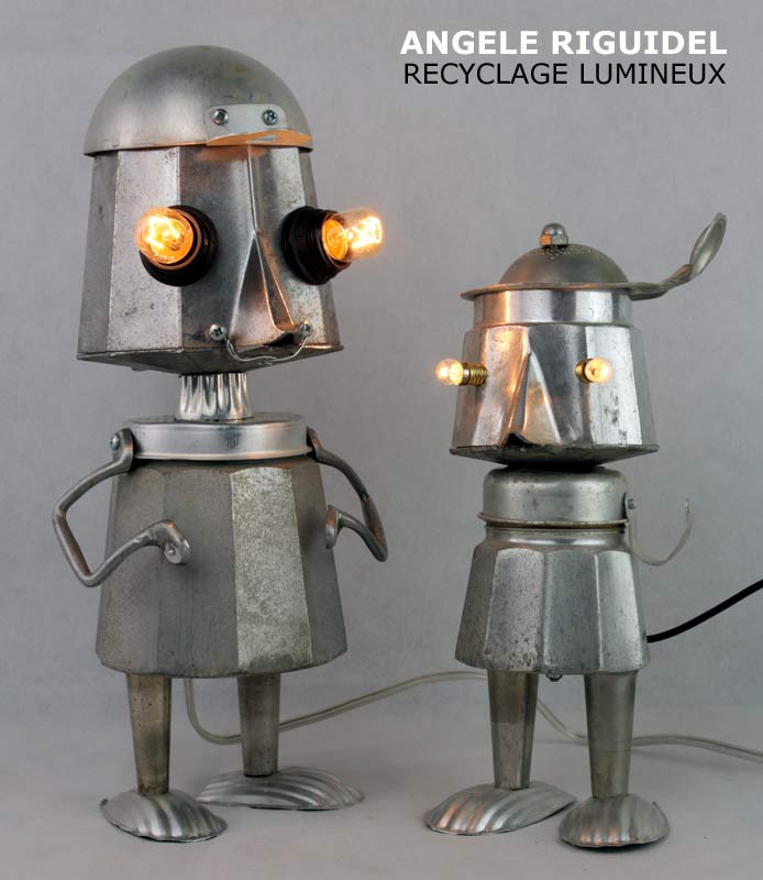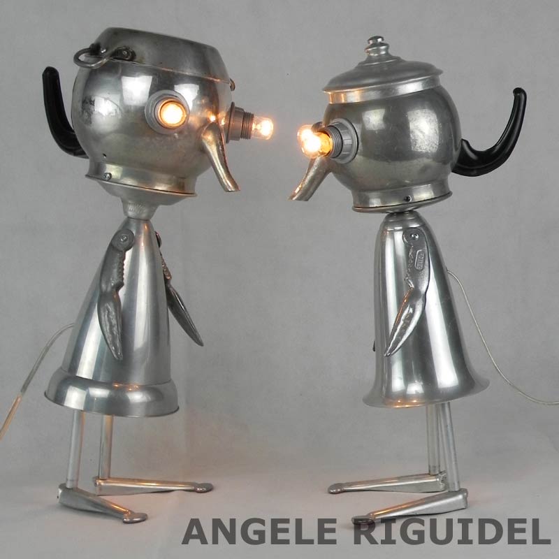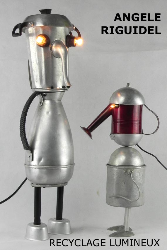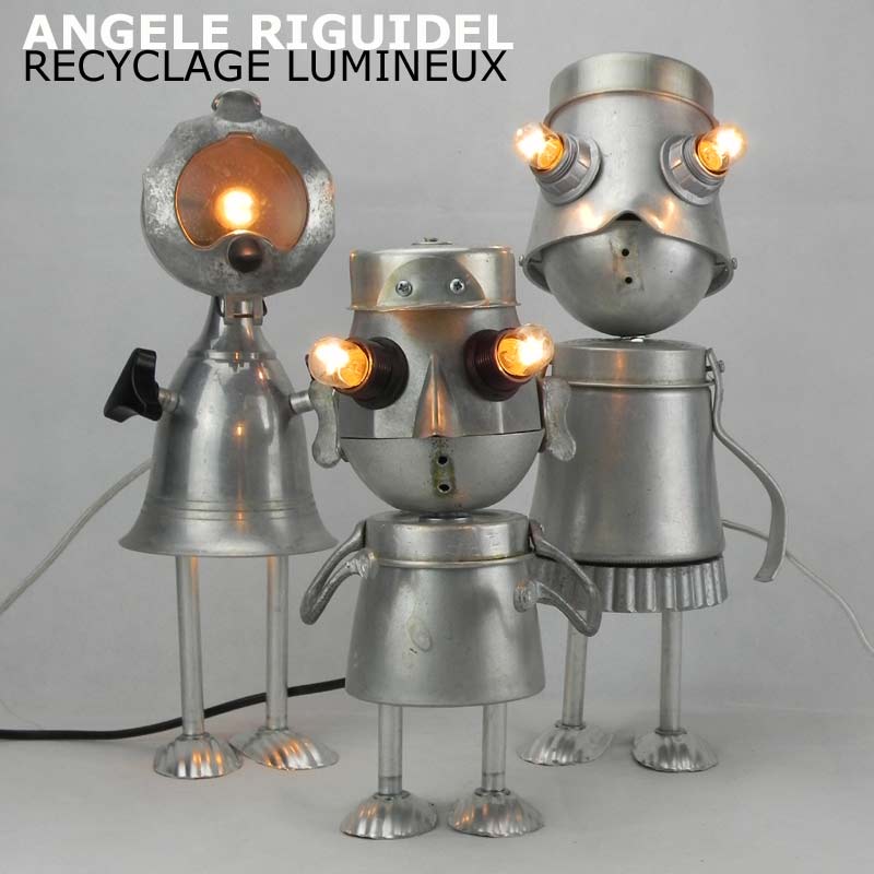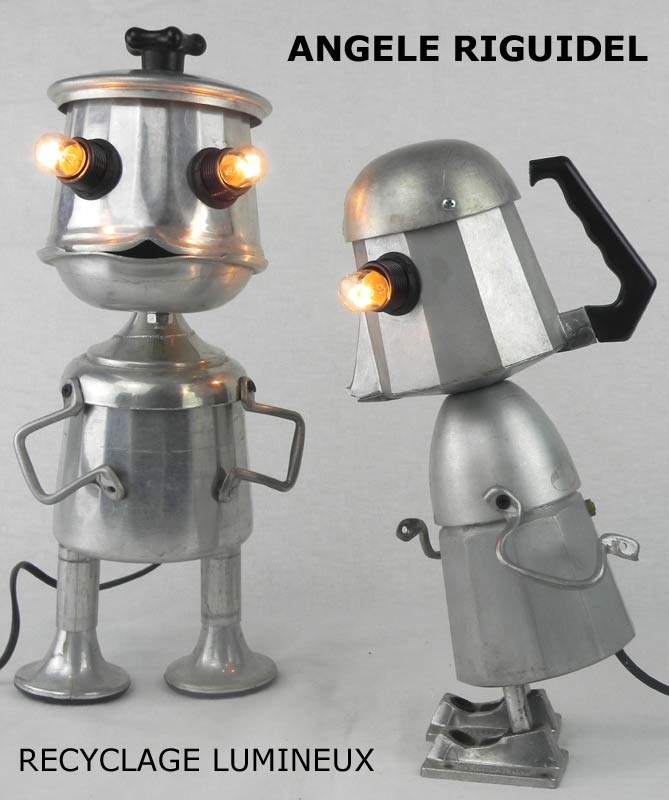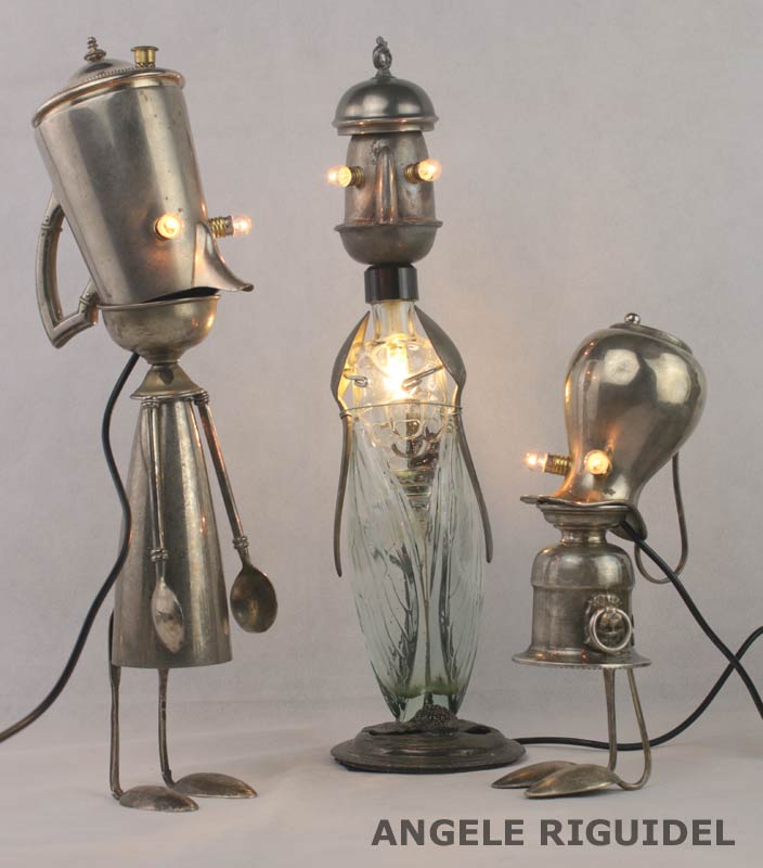Sculptures assemblage d’objets. Robots lampes en aluminium. bouilloires, coupe de sport, cafetière, gamelle, poignées, cuillères.