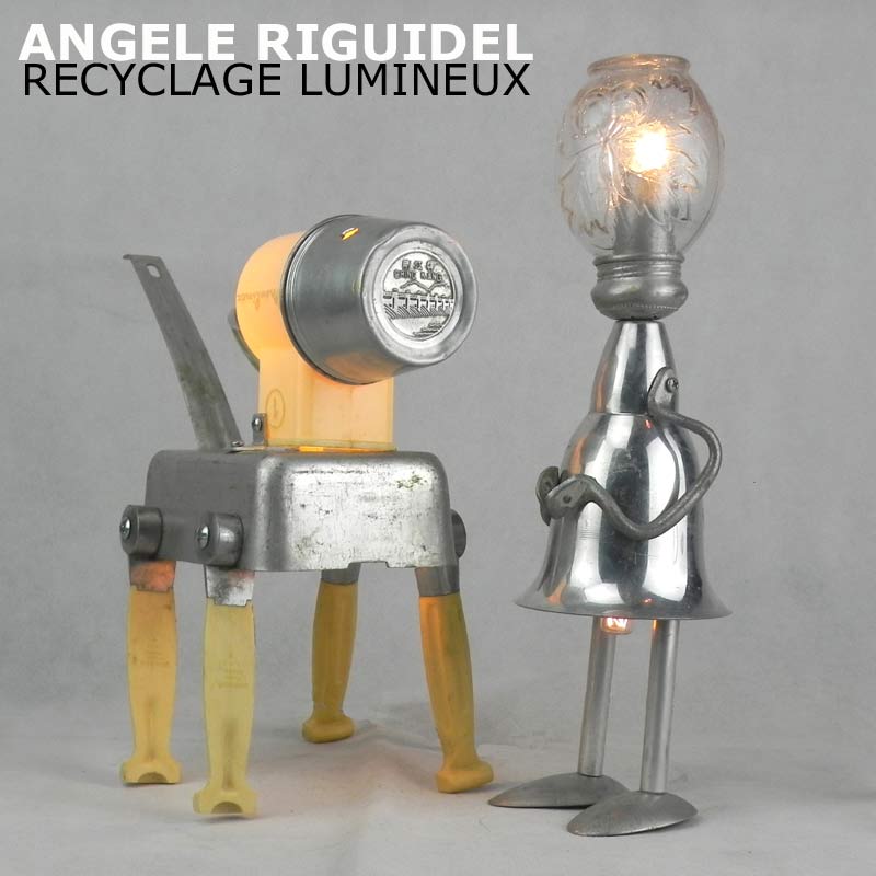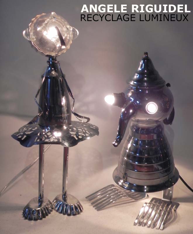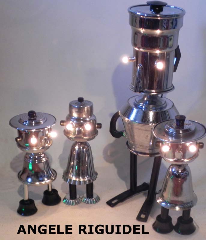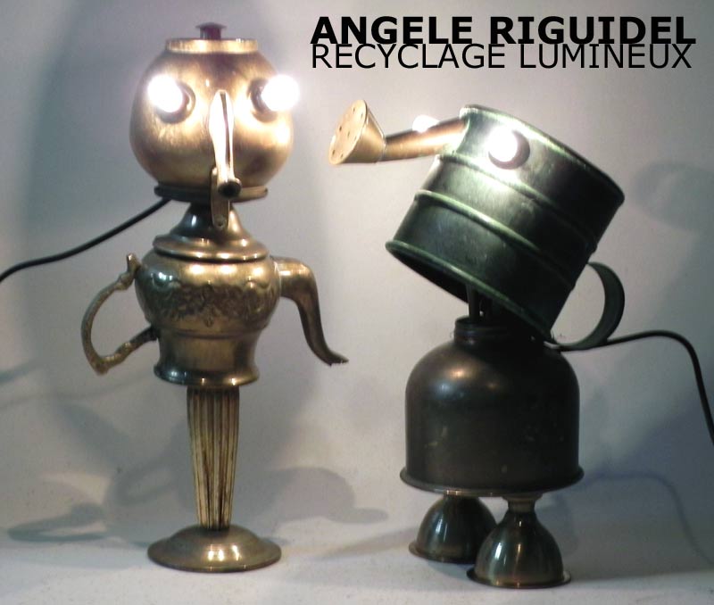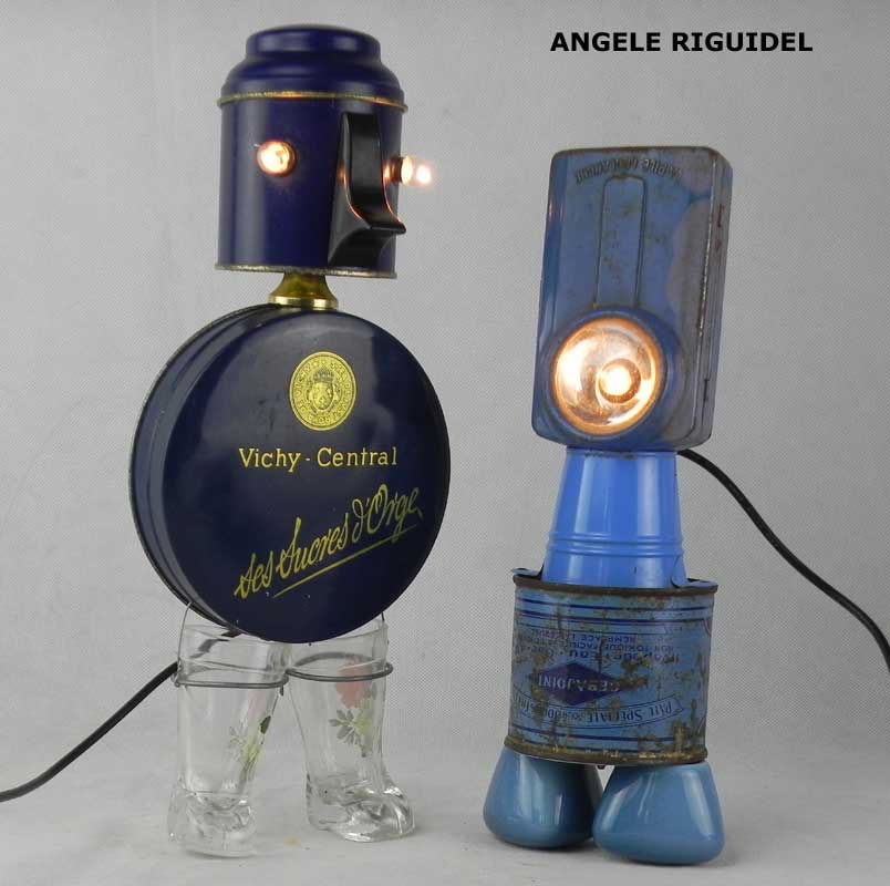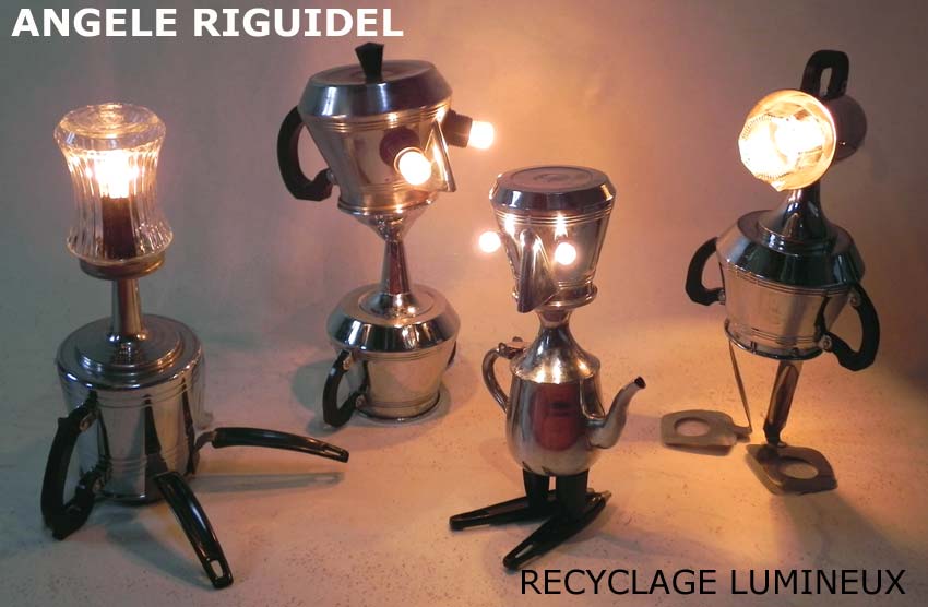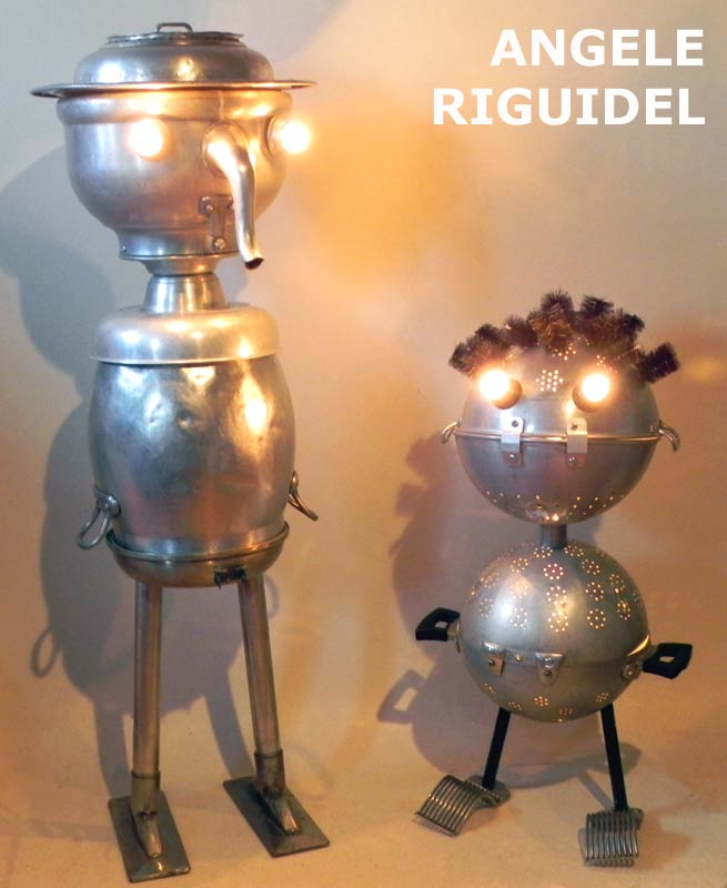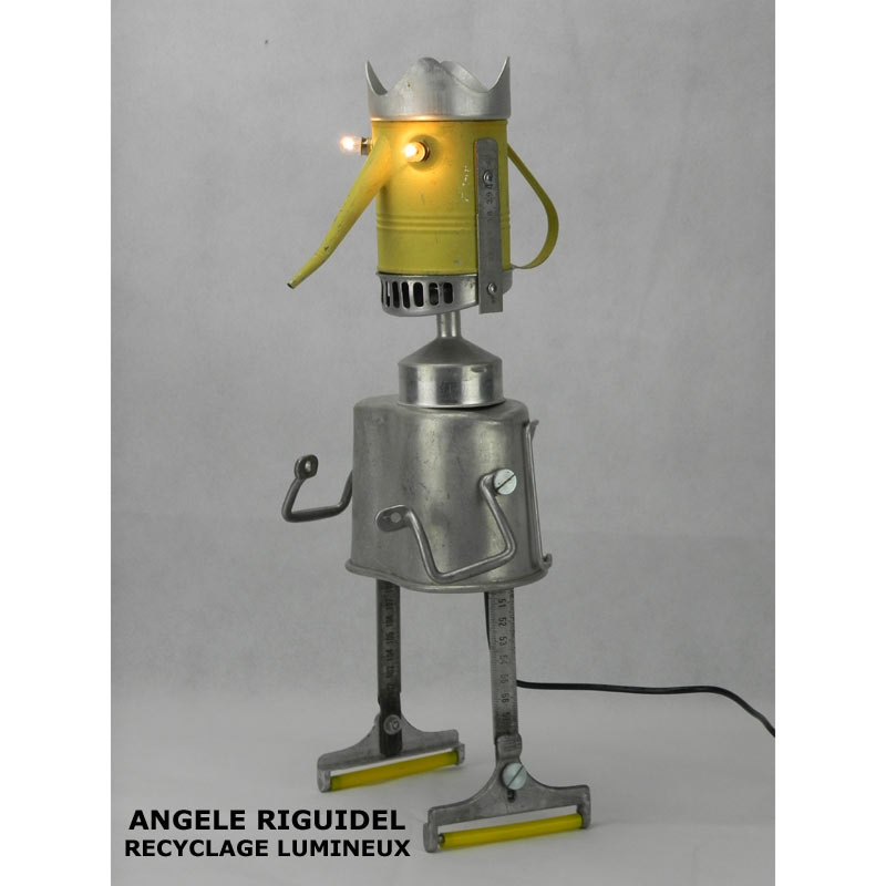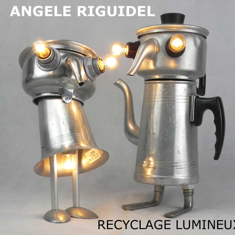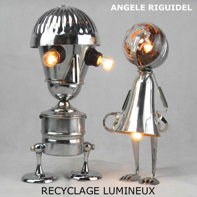 Sculptures assemblage d’objets. Robots lampes en aluminium. bouilloires, coupe de sport, cafetière, gamelle, poignées, cuillères.