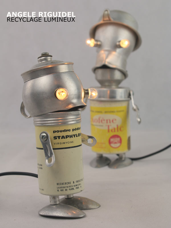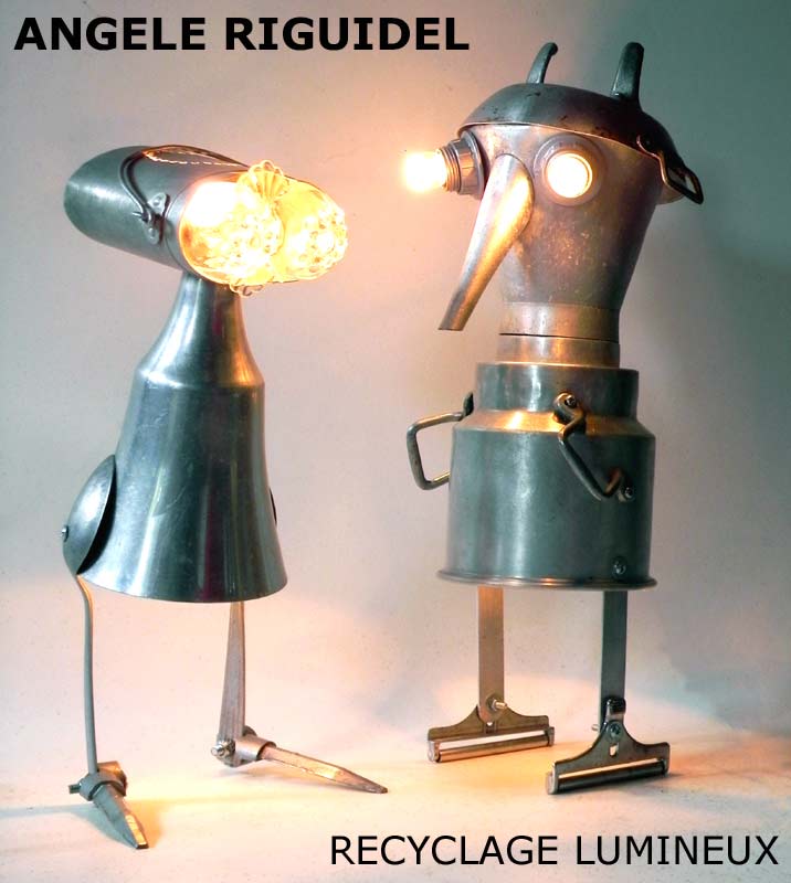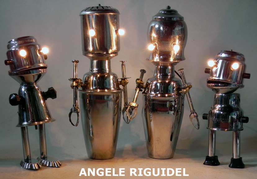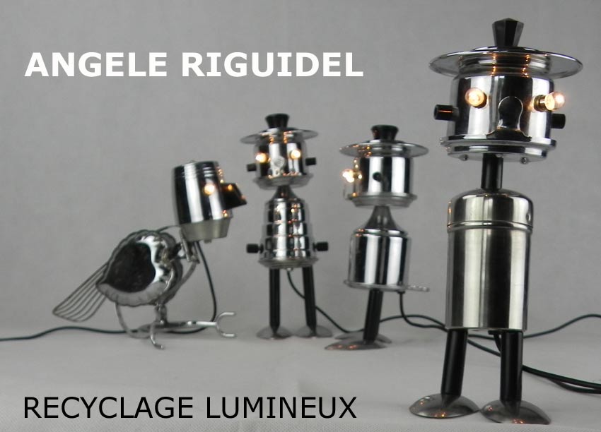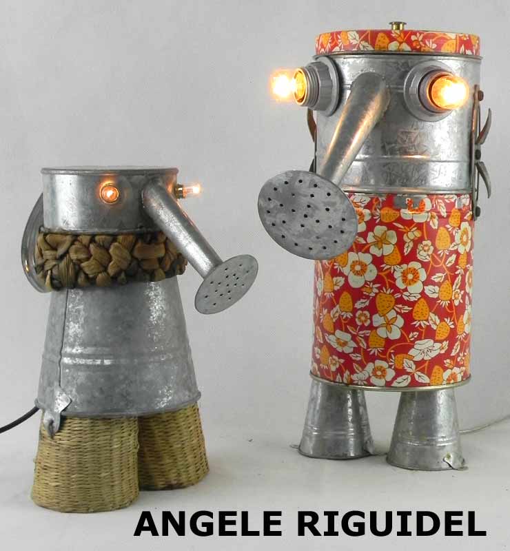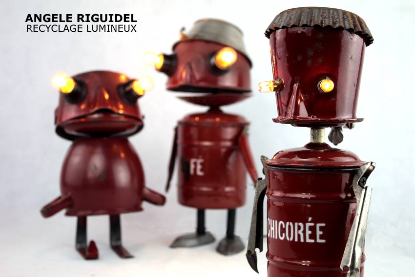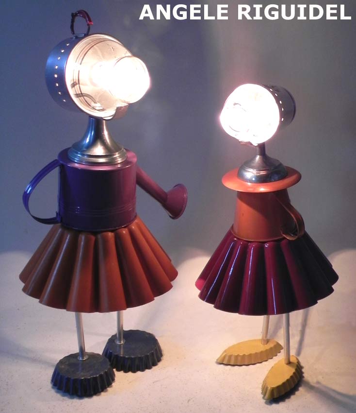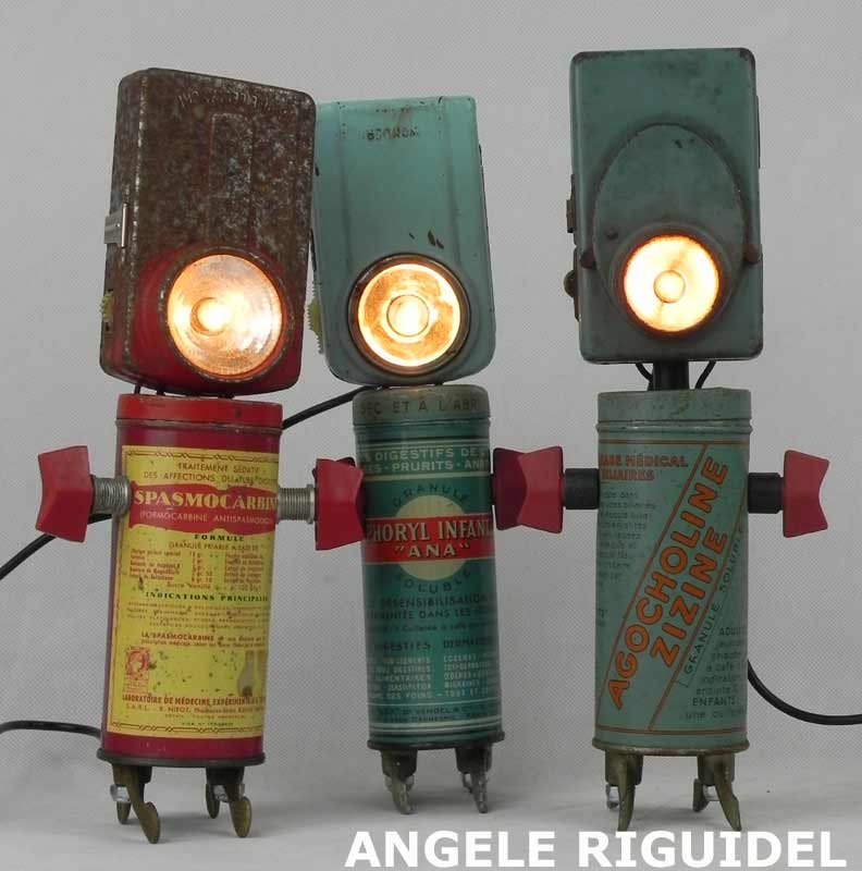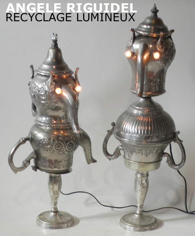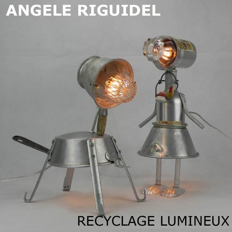 Sculptures assemblage d’objets. Robots lampes en aluminium. bouilloires, coupe de sport, cafetière, gamelle, poignées, cuillères.