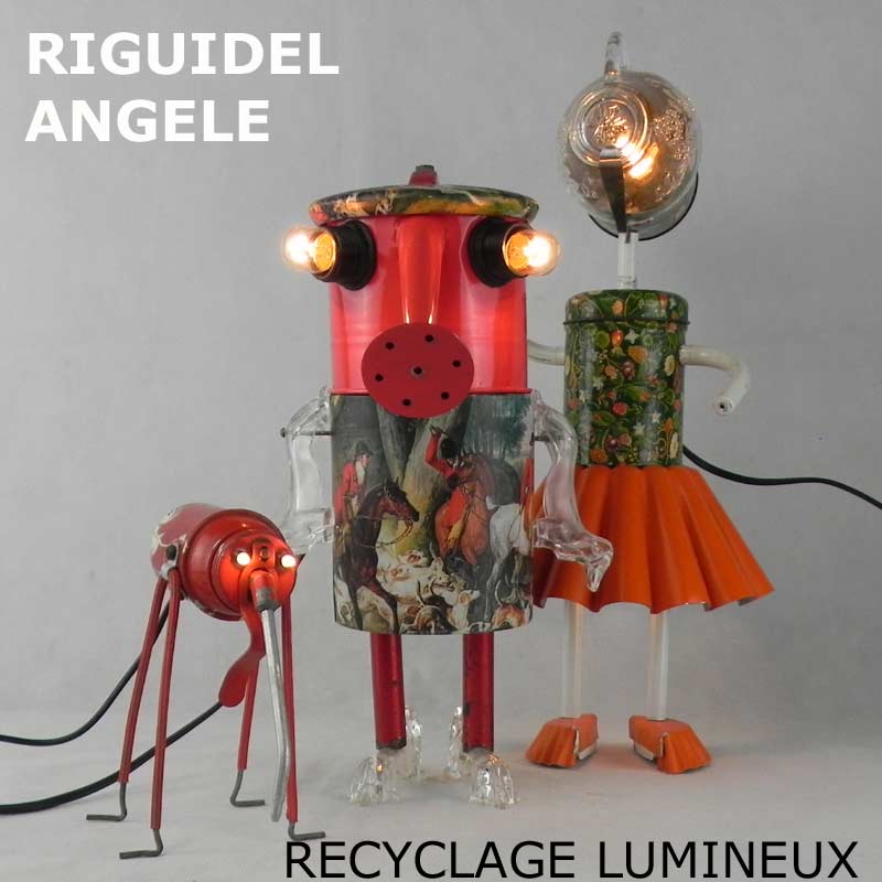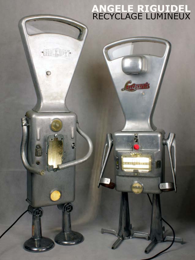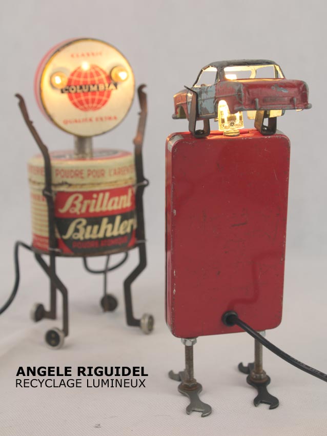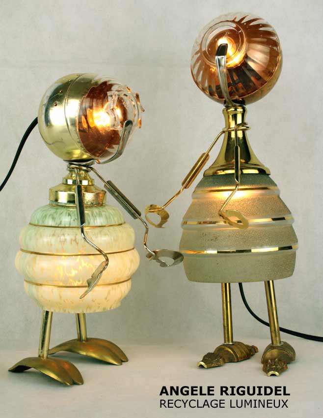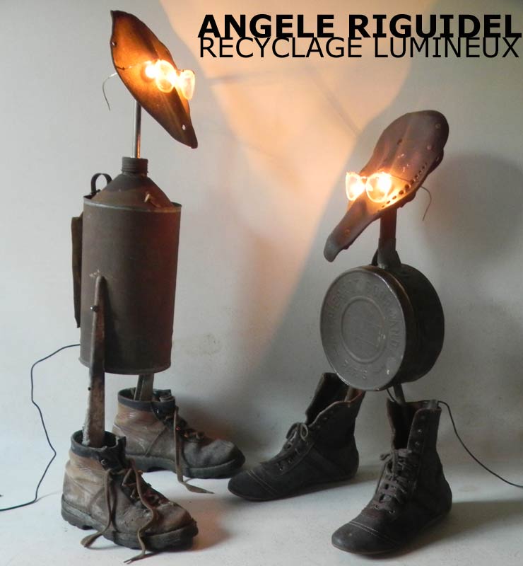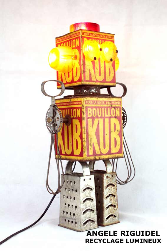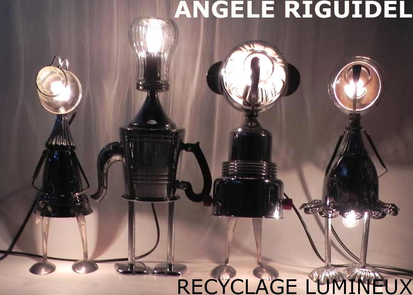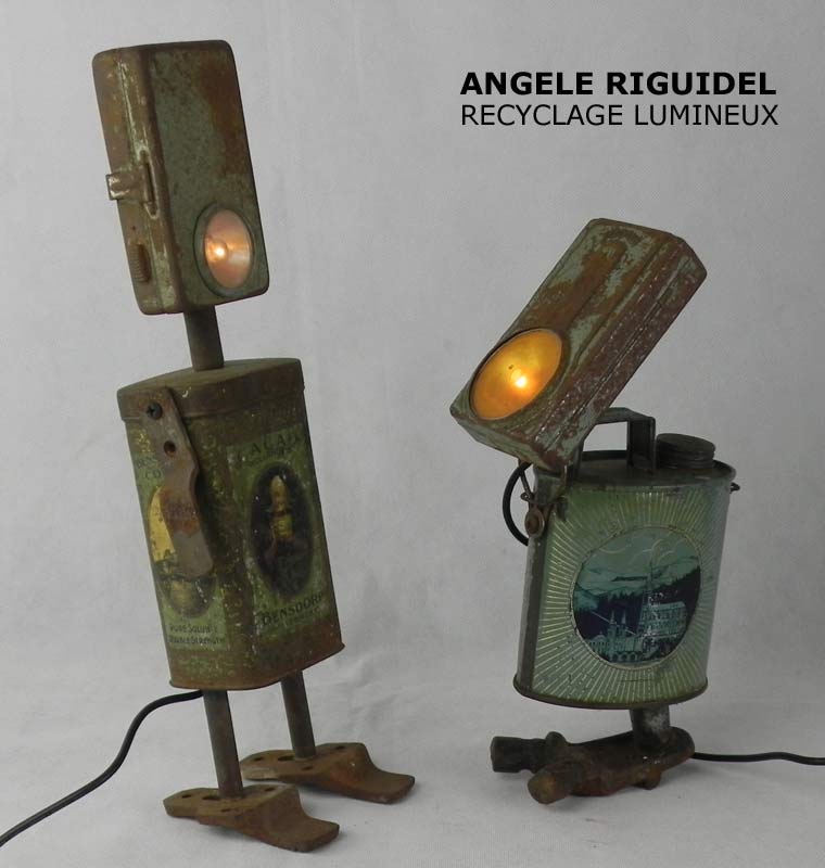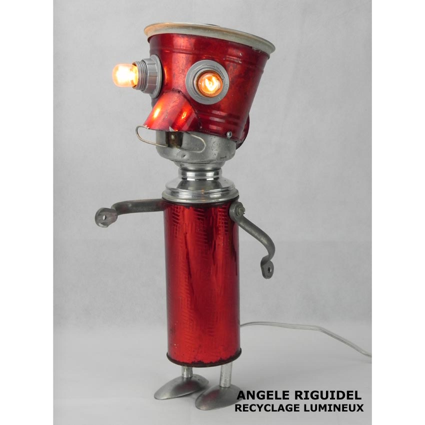 Sculptures assemblage d’objets. Robots lampes en aluminium. bouilloires, coupe de sport, cafetière, gamelle, poignées, cuillères.