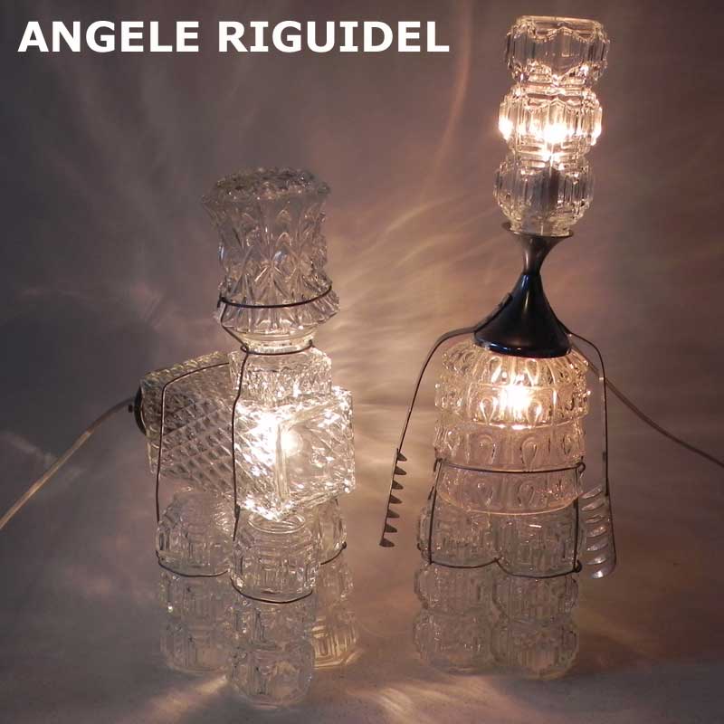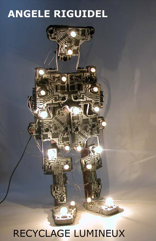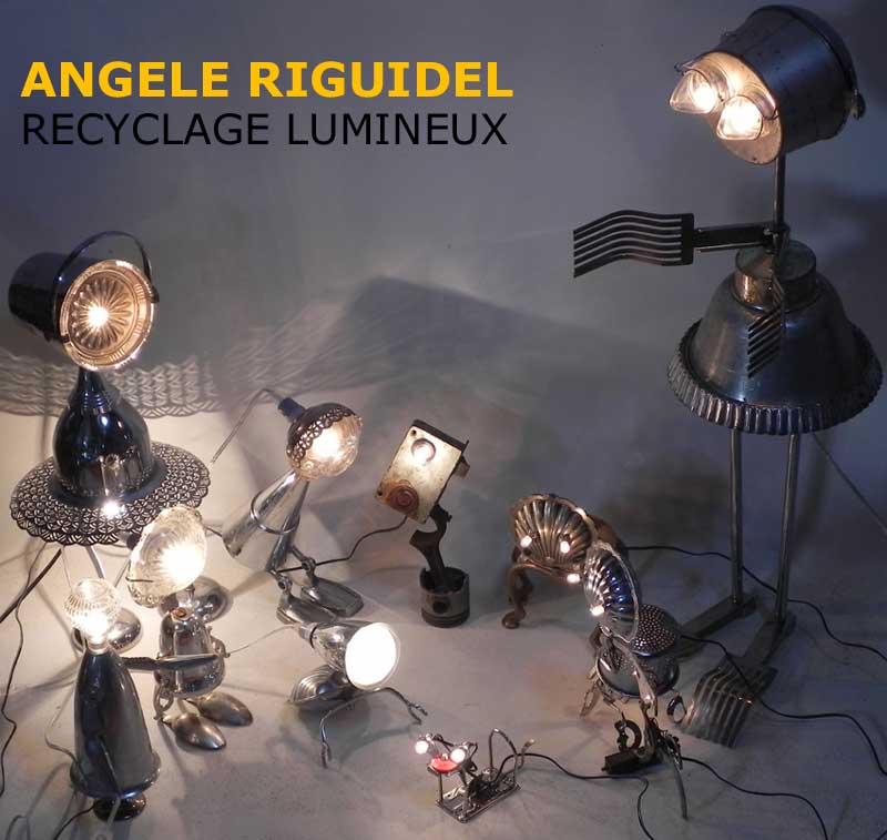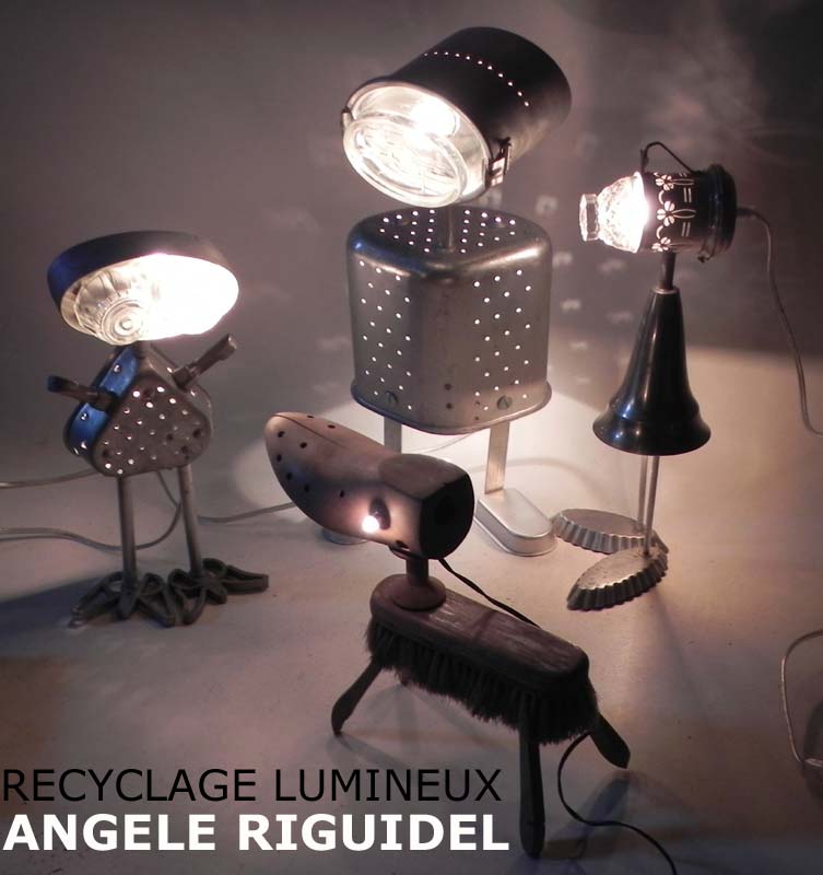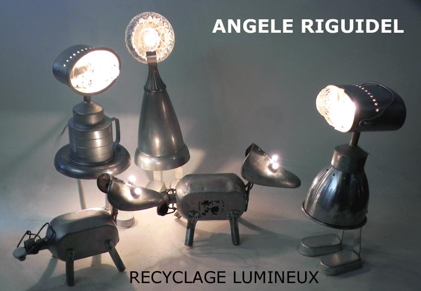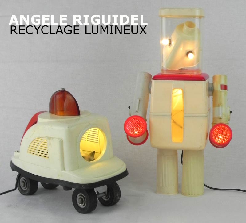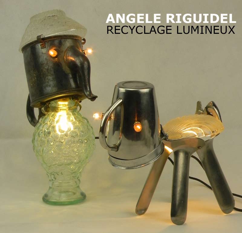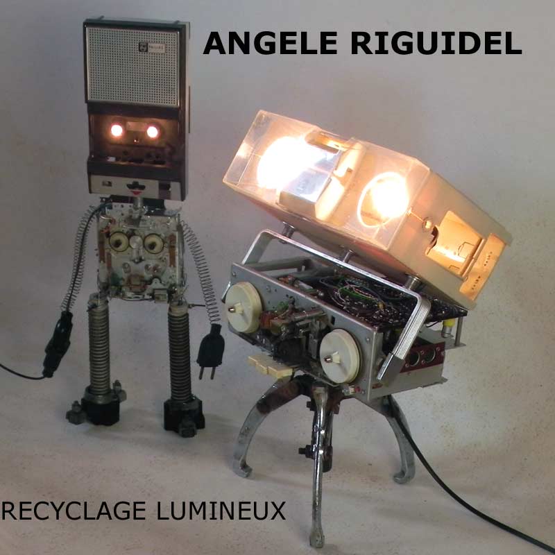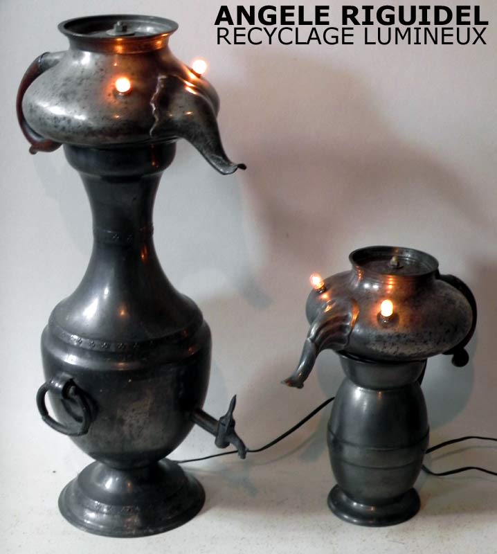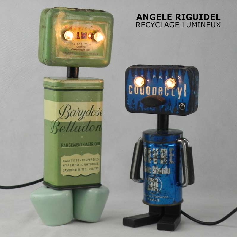 Sculptures assemblage d’objets. Robots lampes en aluminium. bouilloires, coupe de sport, cafetière, gamelle, poignées, cuillères.