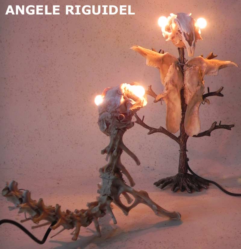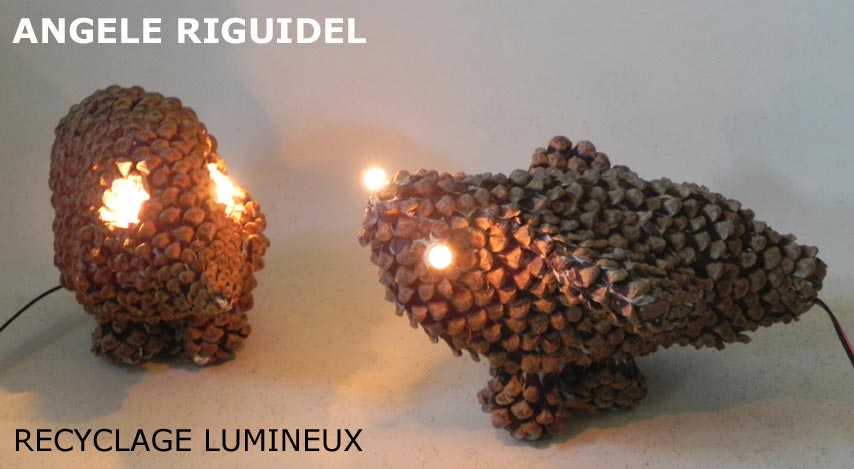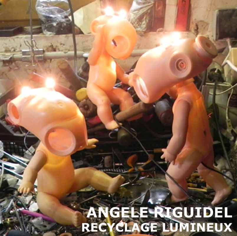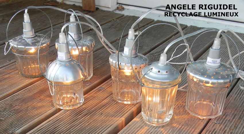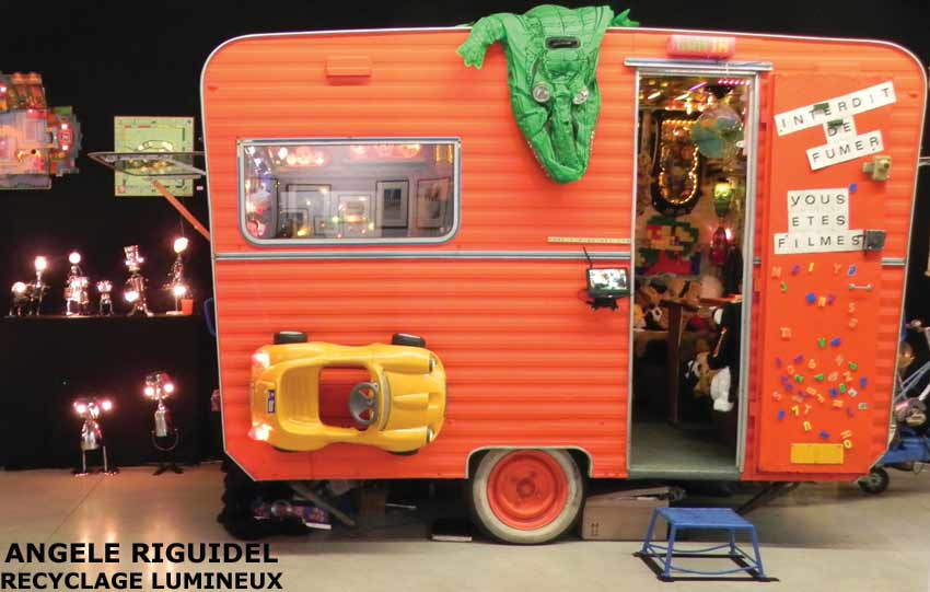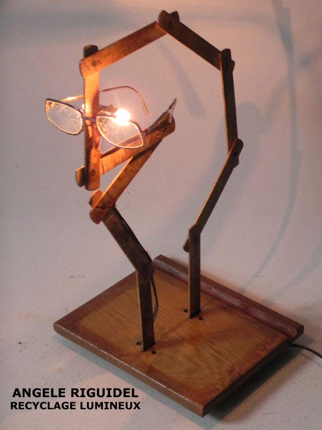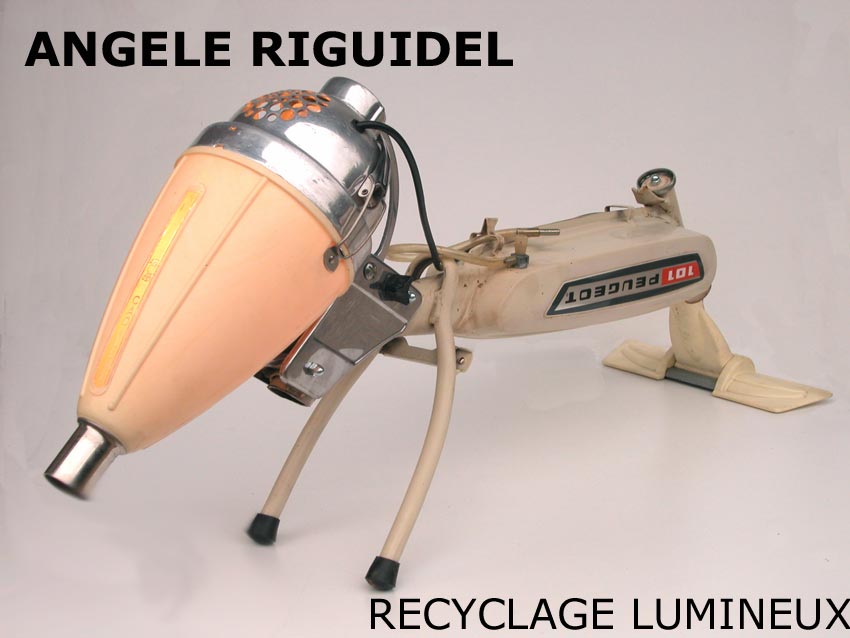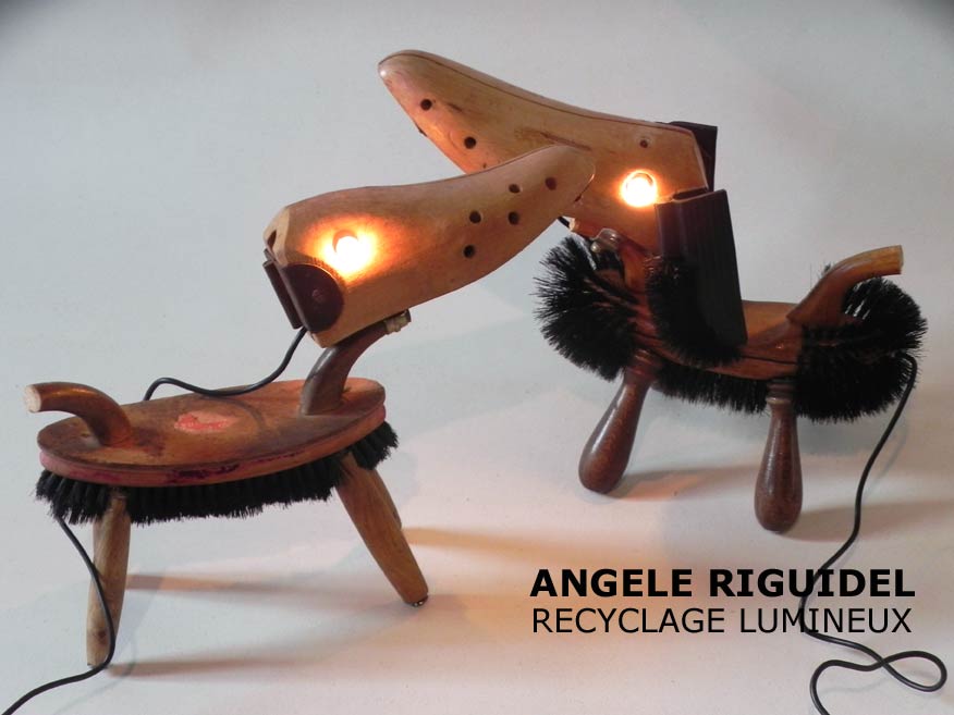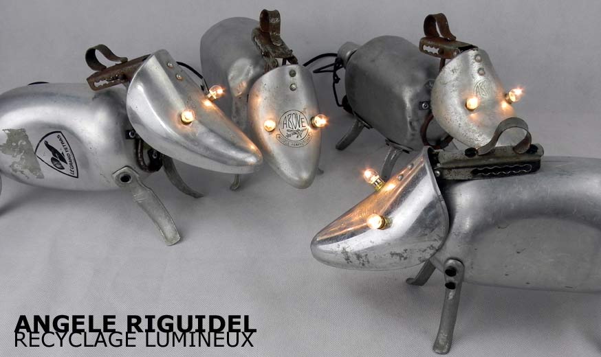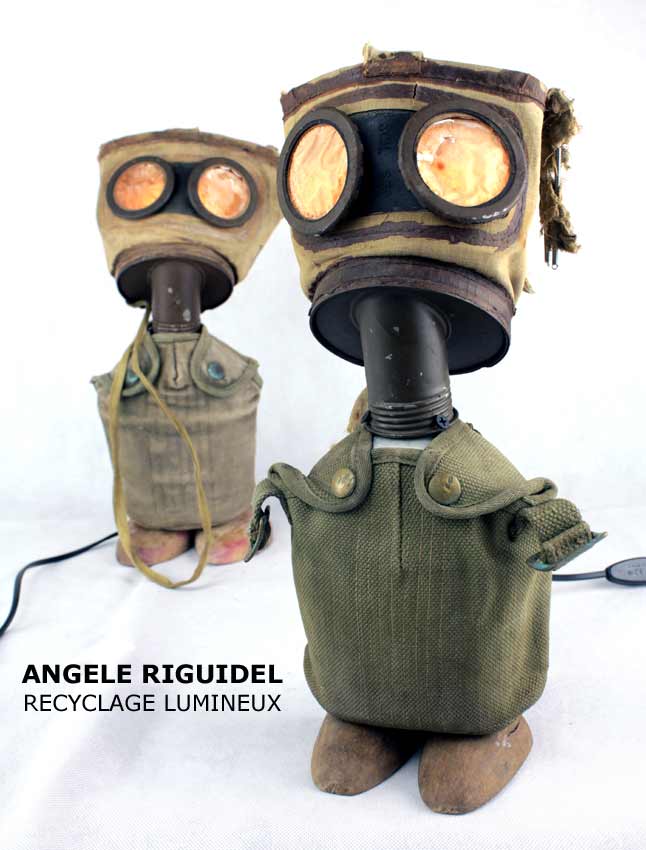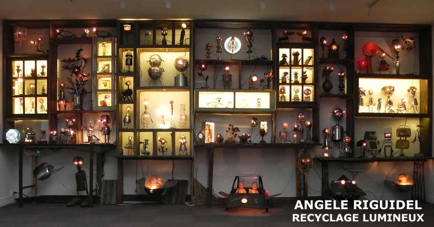 Sculptures assemblage d’objets. Robots lampes en aluminium. bouilloires, coupe de sport, cafetière, gamelle, poignées, cuillères.