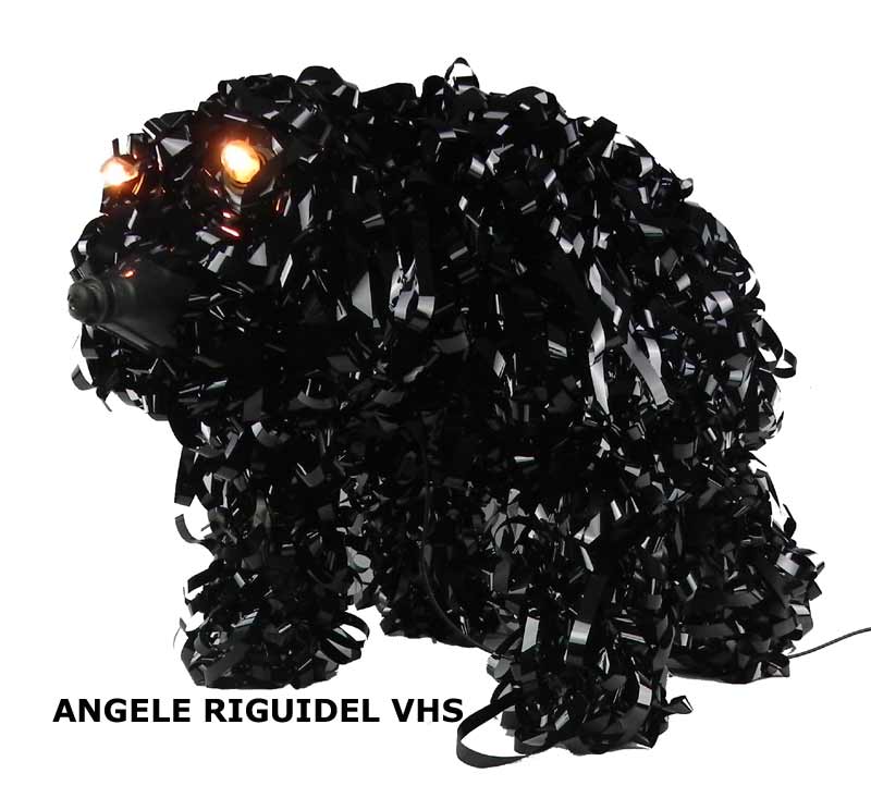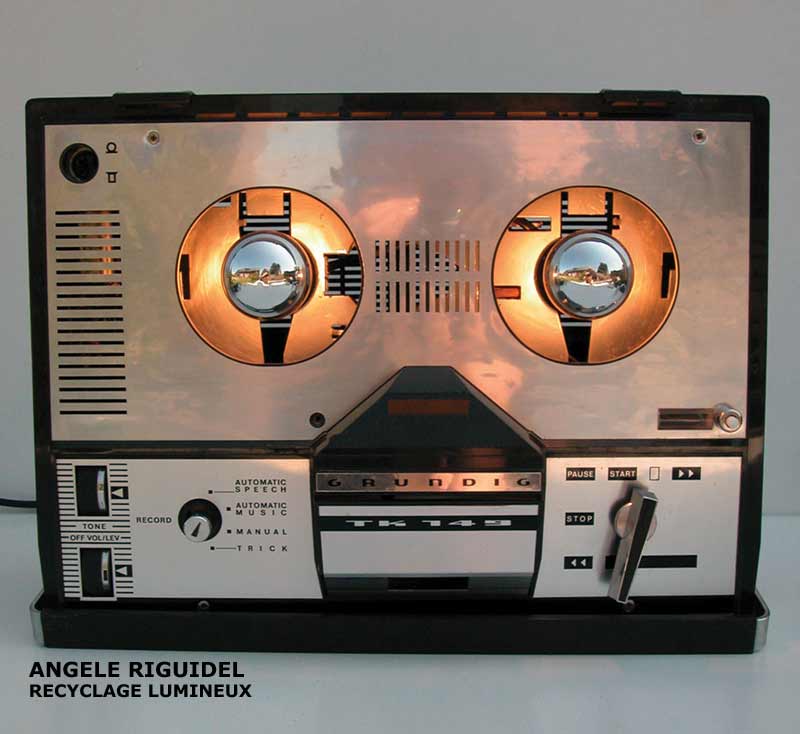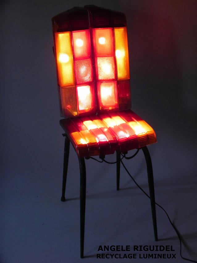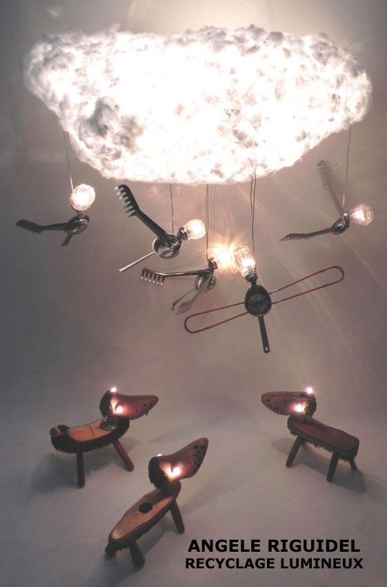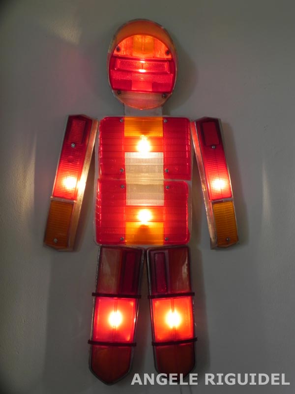 Sculpture assemblage d’objets. Personnages lumineux avec moustache. Arrosoir, thermos, filtre, cuillères, anses… aluminium et rouge. Vintage, lampe.