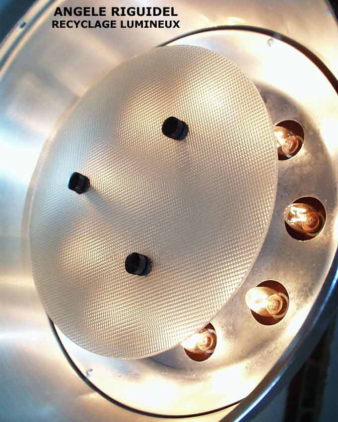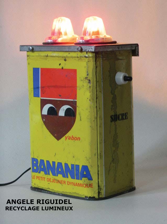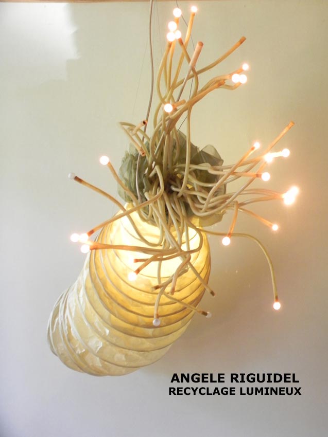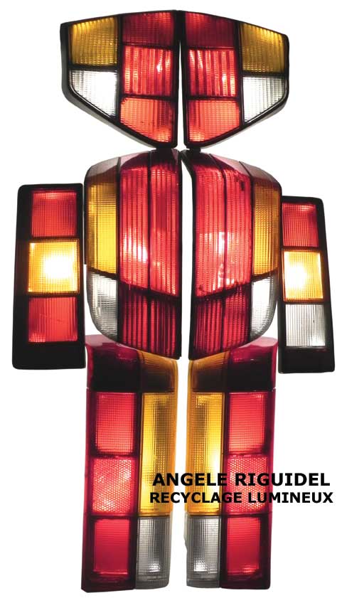 Sculpture assemblage d’objets. Personnages lumineux avec couronne. arrosoir, gamelle, filtre, mètre en alu, anses… aluminium et jaune.