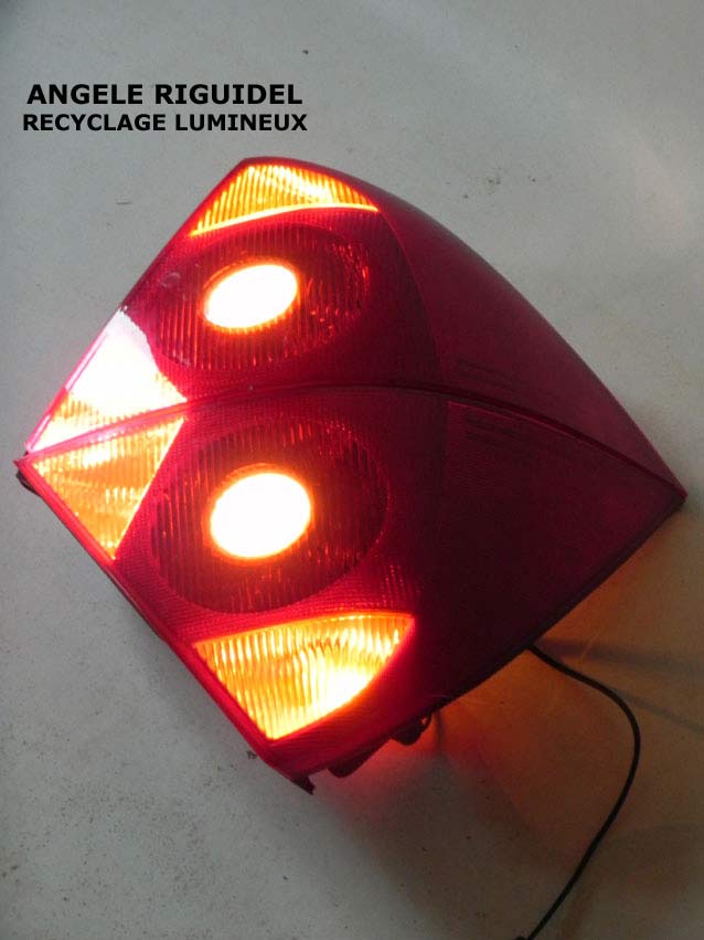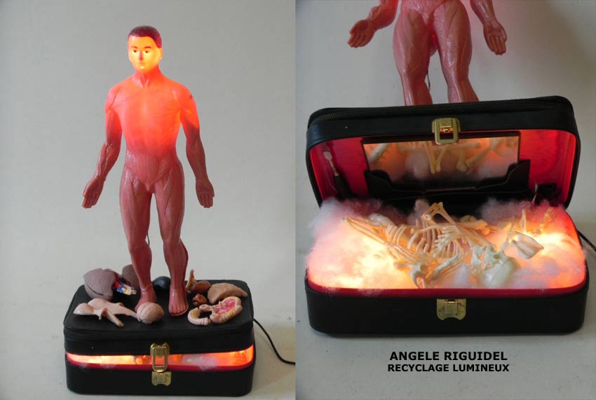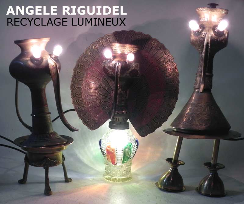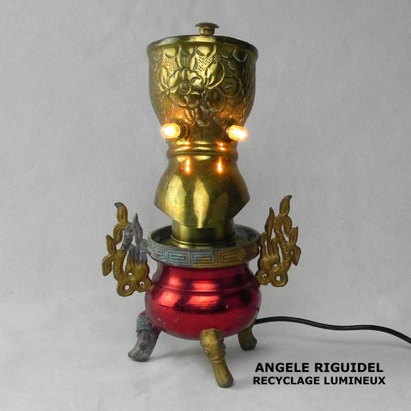 Sculpture assemblage d’objets. Personnages lumineux avec des ailes. laiton et rouge. Oriental, lampe.