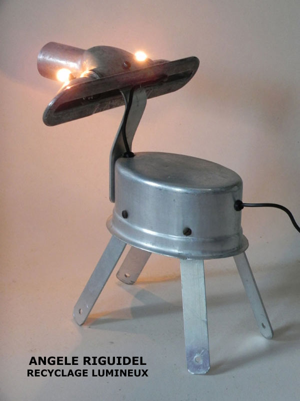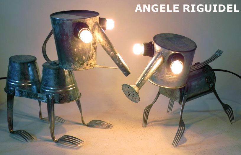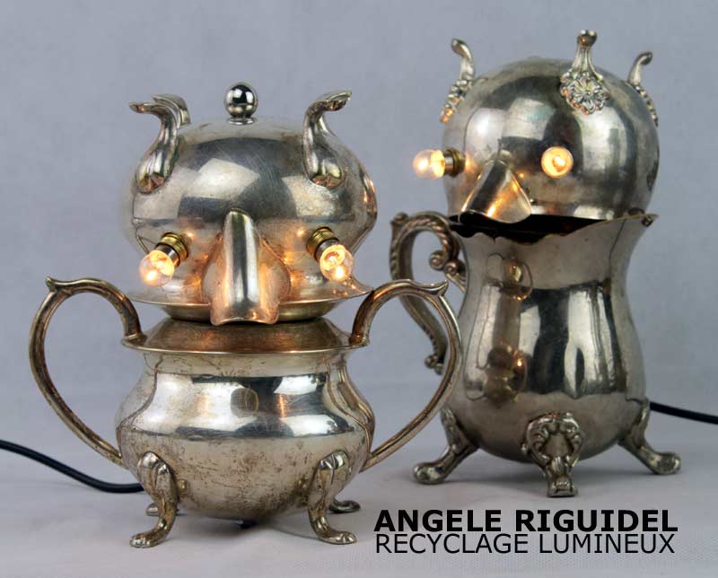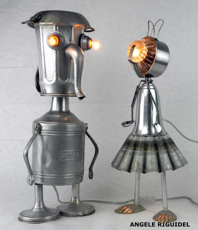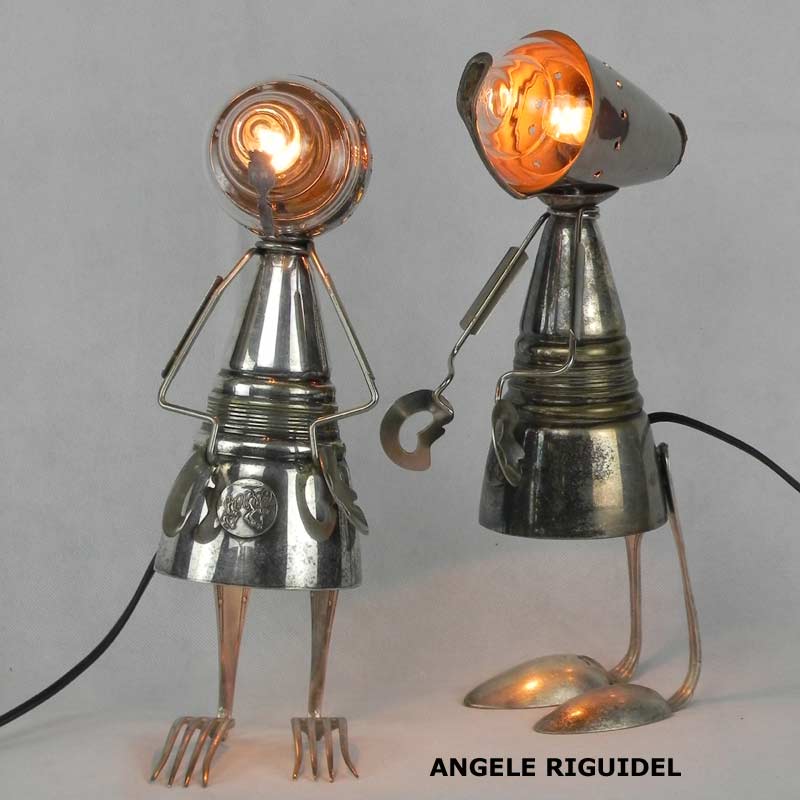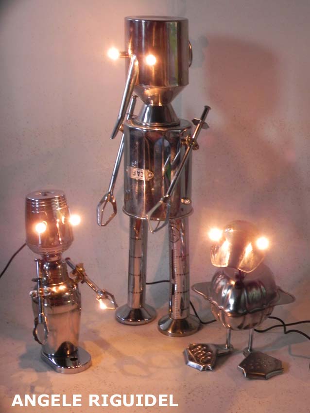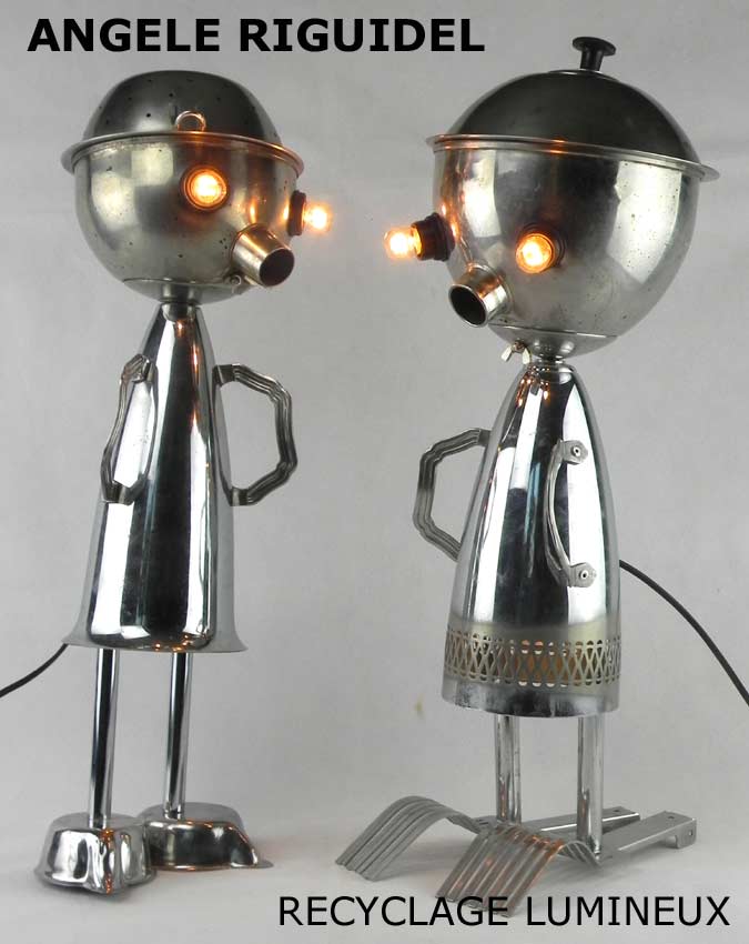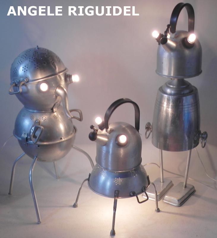 Sculptures assemblage d’objets. Robots lampes en inox. bouilloires, coupe de sport, gamelle, couvercle, pince à trancher, sauciers, poignées.