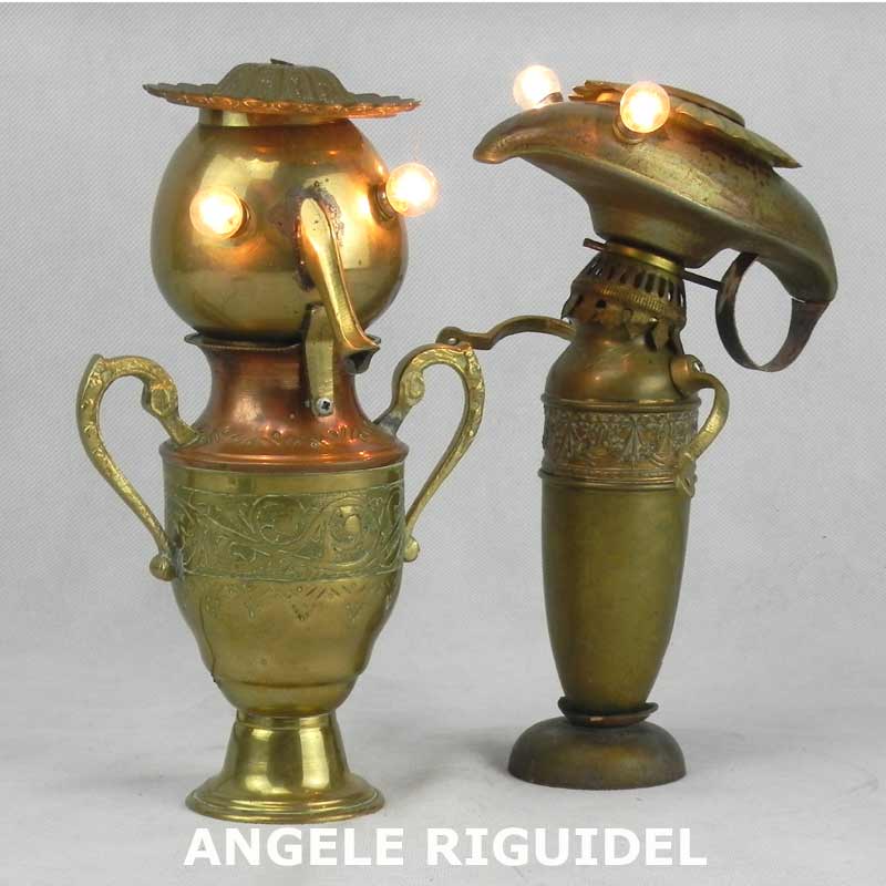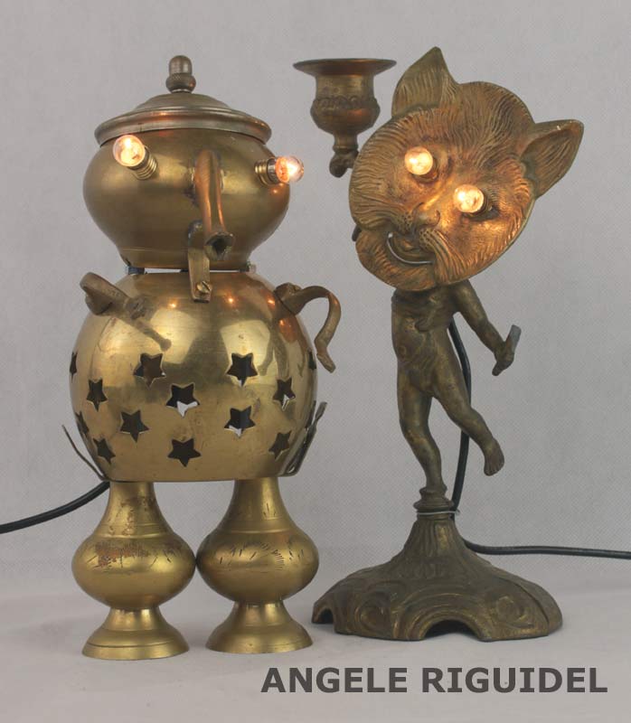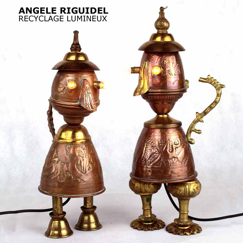 Sculptures assemblage d’objets. Robots lampes en laiton et cuivre. Pot, théière, lampe à huile, vase, bec de gaz.
