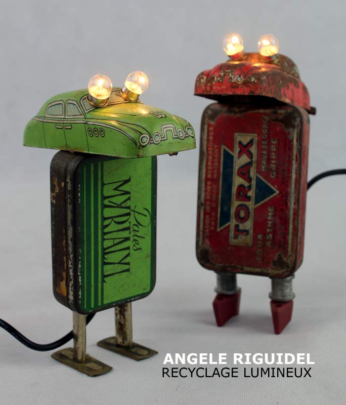 Robots lumineux avec boites vintages. Jouets ancien, touches machine à écrire, poignées… Assemblage d’objets anciens.